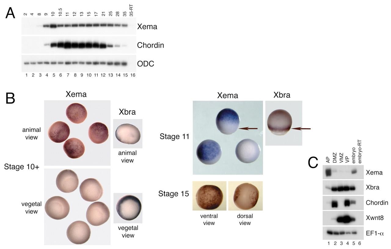 Fig. 2. Expression of Xema during early development. (A) RT-PCR analysis of Xema temporal expression. The `-RT' lane contains all reagents except for reverse transcriptase and was used as a negative control. Ornithine decarboxylase (ODC) was used as a loading control (Bassez et al., 1990). Chordin expression is initiated zygotically and was used as a staging control. (B) Whole-mount in situ hybridization of early gastrula (stage 10+), midgastrula (stage 11), and early neurula (stage 15) stage embryos, using antisense Xema and Xenopus brachyury (Xbra) probes. Xema expression is seen as a blue stain throughout the animal pole of gastrula-stage albino embryos; Xema expression is excluded from the marginal zone (denoted by arrows at stage 11) and vegetal pole. Expression of the panmesodermal marker Xbra is found only in the marginal zone of gastrula stage embryos and was used as a control. Xema is expressed in the vental ectoderm (epidermis) of early neurula stage embryos (ventral view); expression is excluded from the neural plate (dorsal view). (C) RT-PCR analysis of Xema expression in early gastrula stage explants. EF1-α was used as a loading control (Krieg et al., 1989). Xbra is a panmesodermal marker at this stage (Smith et al., 1991), chordin is a dorsal endomesodermal marker (Sasai et al., 1994), and Xwnt8 is a ventrolateral marker (Christian et al., 1991; Smith and Harland, 1991).
