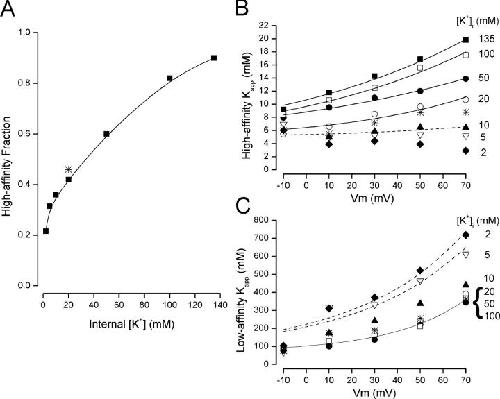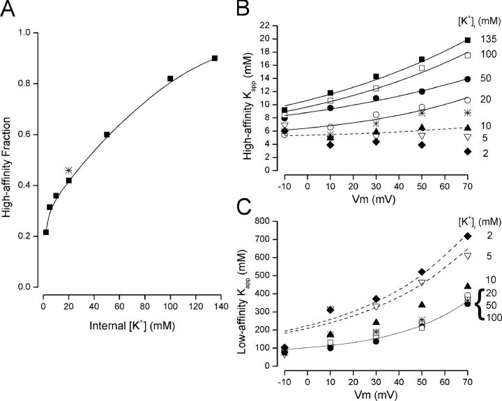 Figure 3. . Properties of the two components of external TEA block. (A) Fraction of high-affinity block as a function of internal K+ with 5 mM external K+ (▪) except for the 2 mM data, which were obtained with 2 mM external K+. Data were also obtained with 20 mM external and 20 mM internal K+ (*). The solid line is a fitted spline function and serves only to connect the data points. (B) Voltage dependence of the Kapphigh values at the indicated internal K+ concentrations (different symbol for each internal K+ level) with 5 mM external K+ except for the 2 mM data, which were obtained with 2 mM external K+. Data were also obtained with 20 mM external and 20 mM internal K+ (*). The solid lines are fits of Eq. 3a to the data all with a KT2 value of 5 mM and the δ2 and Keq2(0) values shown in Fig. 5. (C) Voltage dependence of the Kapplow values at the indicated internal K+ levels with 5 mM external K+ (same symbols as in B) except for the 2 mM data, which were obtained with 2 mM external K+. Data were also obtained with 20 mM external and 20 mM internal K+ (*). Solid line is from Eq. 3b with KT1, δ1, and Keq1(0) values of 70 mM, 0.78, and 0.47, respectively. The dashed line associated with the 5 mM K+ data (▿) is from Eq. 3b with KT1, δ1, and Keq1(0) values of 70 mM, 0.5, and 2, respectively. The dashed line associated with the 2 mM K+ data (♦) is from Eq. 3b with KT1, δ1, and Keq1(0) values of 70 mM, 0.52, and 2.1, respectively.