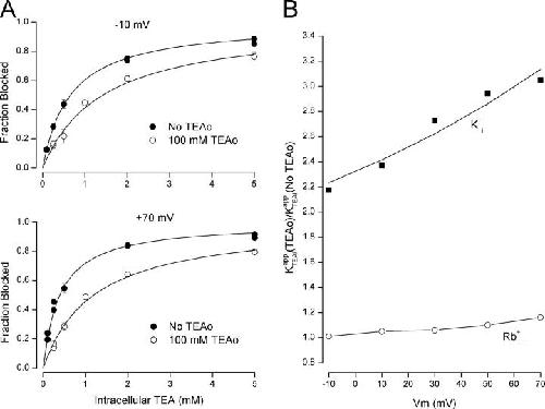 Figure 4. . Determination of the affinity and apparent voltage dependence for K+ binding to an internal site. (A) Fraction of current at −10 mV (top) and +70 mV (bottom) blocked by the indicated internal TEA concentrations in the absence (•) and presence (○) of 100 mM external TEA with 135 mM internal K+. Symbols with standard error limits represent mean values from 3–4 measurements. Symbols without error bars represent individual measurements. Solid lines are fits of Eq. 1 to the data with Kapp values at −10 mV of 0.65 and 1.4 mM and at +70 mV of 0.39 and 1.2 mM in the absence and presence of external TEA, respectively. (B) The ratio of the Kapp values for internal TEA block in the presence and absence of external TEA with 135 mM internal K+ (▪) and with the internal K+ replaced by Rb+ (○). The solid line with the internal K+ data is the best fit of Eqs. 3 and 4 to the data with KK(0) and δ values of 102 mM and 0.17, respectively. The line connecting the Rb+ data has no theoretical meaning.