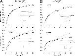 Figure 1. . Low internal K+ reveals two components of external TEA block. Fraction of Shaker K+ channel current blocked by external TEA in 50 mM (A) and 5 mM (B) internal K+ at −10 mV (top) and +70 mV (bottom). Data points are the mean values from 3 to 6 measurements with standard error limits for those whose errors are larger than the symbol size. Insets show raw currents in the absence (Control) and presence of 50 mM external TEA. Calibrations: (A) −10 mV, 50 pA/10 ms; +70 mV, 0.2 nA/10 ms; (B) −10 mV, 50 pA/10 ms; +70 mV, 0.1 nA/10 ms. Dashed lines are fits of Eq. 1 to the data with Kapp values of (A) −10 mV, 20 mM; +70 mV, 43 mM; (B) −10 mV, 32 mM; +70 mV, 89 mM. Solid lines are fits of Eq. 2 to the data with the A, Kapplow, and Kapphigh parameter values shown in Fig. 2.