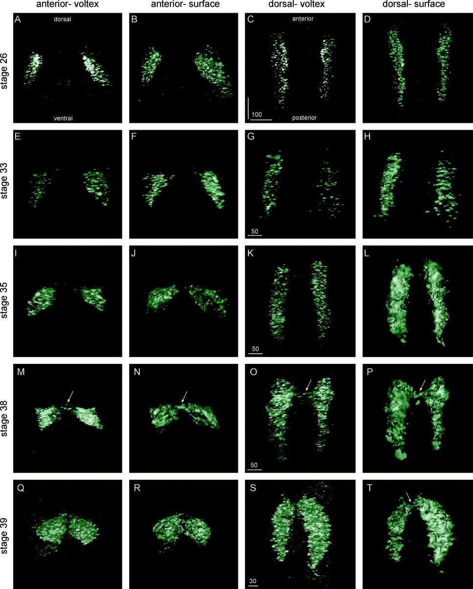 Nephrin (NHPS1) encodes a transmembrane protein of approximately 1,200 amino acids that plays a critical role in podocyte slit-diaphragm formation and the development of functional mammalian glomerular filtration barriers. In humans and mice with congenital defects in the nephrin gene, the glomerular filtration barrier is defective and protein leakage into the kidney filtrate causes a life-threatening proteinuria. This protein also plays an essential role in the formation of the stellate cells of the Drosophila Malpighian tubules. In this report, the sequence and expression of a Xenopus ortholog of nephrin is described using both conventional and novel three-dimensional (3D) visualization methodologies. Xenopus nephrin encodes a protein of 1,238 amino acids and is expressed at high levels in the forming pronephric kidney glomus, the equivalent of the mammalian glomerulus. Expression commences at stage 25 and is specific to the pronephric glomus up until at least tadpole feeding stages. Two-color fluorescent whole-mount in situ analysis of nephrin expression allowed the 3D shape of the glomus to be imaged and contrasted to the pronephric tubules throughout its morphogenesis. Confocal data processing pipelines were established to generate both volumetric and surface models of the developing pronephros, and a Web-based visualization system was used to generate dynamic and manipulable models of the forming nephric organs. This system allows simple on-line morphometric analysis of the developing pronephric components. As in fish embryos, the glomera first form laterally then migrate medially as the pronephros matures. Unlike in the zebrafish, in Xenopus, this migration stops short of complete fusion of the two glomera at the midline, but a nephrin-positive glomeral nexus does form anteriorly and links the two structures from stage 38 onward.