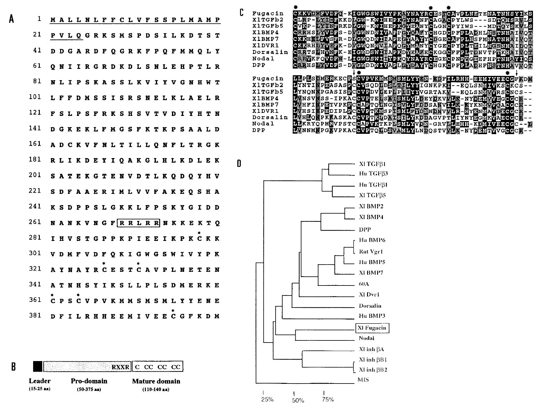 FIG. 1. Sequence of Fugacin and comparison with the TGF-b superfamily. (A) The deduced amino acid sequence of the longest fugacin cDNA
