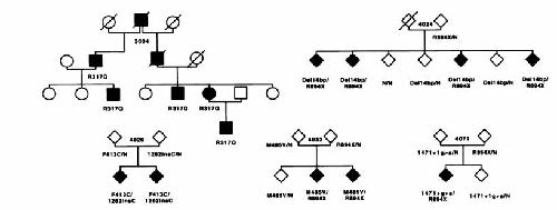 Figure 3 Selected pedigrees with mutation results from the present study. Pedigree 3004 shows autosomal dominantly inherited MC;