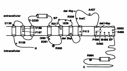 Autosomal dominant myotonia congenita and autosomal recessive generalized myotonia (GM) are genetic disorders characterized by the symptom of myotonia, which is based on an electrical instability of the muscle fiber membrane. Recently, these two phenotypes have been associated with mutations in the major muscle chloride channel gene CLCN1 on human chromosome 7q35. We have systematically screened the open reading frame of the CLCN1 gene for mutations by SSC analysis (SSCA) in a panel of 24 families and 17 single unrelated patients with human myotonia. By direct sequencing of aberrant SSCA conformers were revealed 15 different mutations in a total of 18 unrelated families and 13 single patients. Of these, 10 were novel (7 missense mutations, 2 mutations leading to frameshift, and 1 mutation predicted to affect normal splicing). In our overall sample of 94 GM chromosomes we were able to detect 48 (51%) mutant GM alleles. Three mutations (F413C), R894X, and a 14-bp deletion in exon 13) account for 32% of the GM chromosomes in the German population. Our finding that A437T is probably a polymorphism is in contrast to a recent report that the recessive phenotype GM is associated with this amino acid change. We also demonstrate that the R894X mutation may act as a recessive or a dominant mutation in the CLCN1 gene, probably depending on the genetic background. Functional expression of the R894X mutant in Xenopus oocytes revealed a large reduction, but not complete abolition, of chloride currents. Further, it had a weak dominant negative effect on wild-type currents in coexpression studies. Reduction of currents predicted for heterozygous carriers are close to the borderline value, which is sufficient to elicit myotonia.