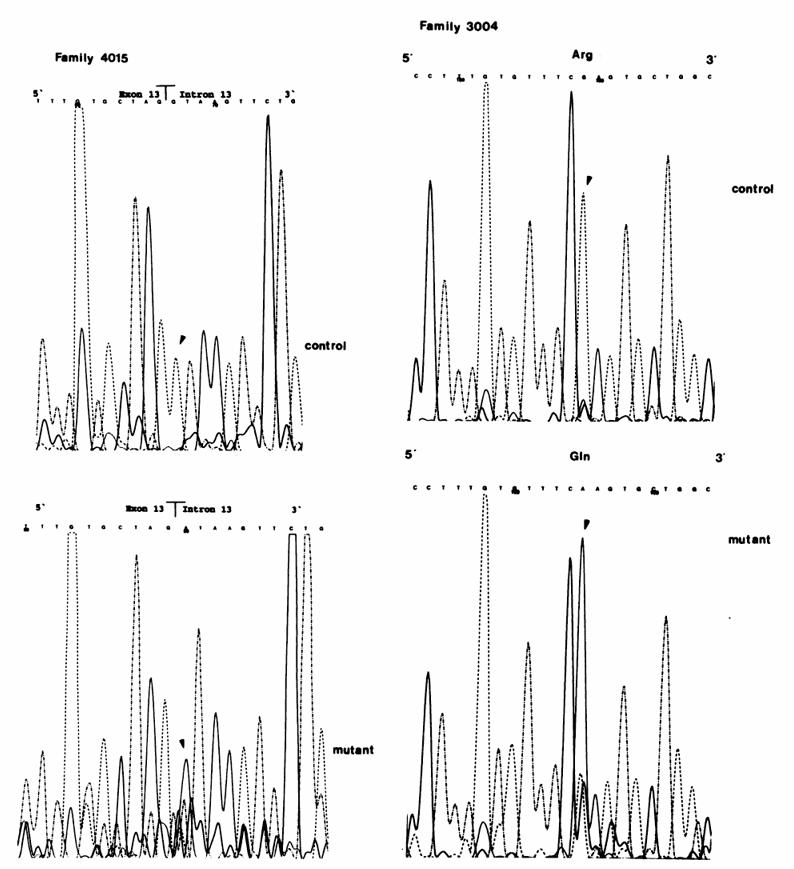 mutation 1471 + 1 g to a in exon 13 in GM family 4015 (pedigree and SSCA in fig. 4).