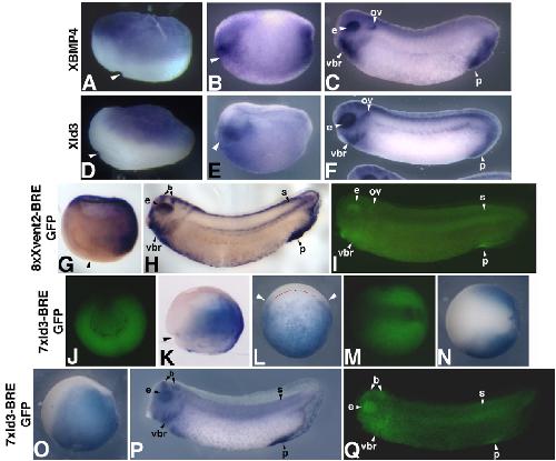 Fig. 6. The Xvent2 and XId3 BREs direct expression of a GFP reporter gene to regions of BMP activity in transgenic frogs. Expression of XBMP4 compared to XId3 expression in gastrula, neurula, and tailbud stage embryos is shown in panels (A) and (DF), respectively. Unless otherwise indicated, for gastrula stages, dorsal is to the left and the animal pole up. For neurula stages, anterior is to the left and dorsal is up. For tailbud stages, lateral views are shown. (A, D) At the gastrula stage (10.5), both genes are expressed in the animal cap and excluded from part of the area above the dorsal blastopore lip (arrowheads). (B, E) At the neurula stage (14 5), both XId3 and XBMP4 are expressed in the future cement gland (arrowhead) and the ventral region. (C, F) At tailbud stages (2728), both genes are expressed in the proctodeum (p), the ventral branchial arch/heart region (vbr), the eyes (e), and the otic vesicle (ov). (G) Expression of the 8xXvent2-BRE/GFP-reporter gene analyzed in transgenic embryos. (G) Gastrula stage embryo (stage 10.511); arrowhead, dorsal blastopore lip. GFP mRNA is expressed on the ventral side only, including the ventral marginal zone and the ventral ectoderm. (H) Stage 32 embryo; stained with antisense GFP mRNA. (I) Stage 32 embryo, showing GFP protein fluorescence of the eye (e), ventral branchial arch/heart region (vbr), otic vesicle (ov), somites (s) and proctodeum (p). (J ) Expression of the 7xId3 BRE/GFP reporter gene in transgenic embryos; (J, M, Q) fluorescence of GFP protein; (K, L, N, O, P) expression of GFP mRNA. (J) Stage 11 embryo, vegetal view, dorsal is up. GFP protein is expressed ventrally and laterally but not dorsally. Note that there is also fluorescence in the yolk plug. (K) Stage 10.5 embryo; arrowhead, dorsal blastopore lip. GFP mRNA expression is excluded from the dorsal side. (L) Stage 10.5 embryo, uncleared, vegetal view, dorsal is up; white arrowheads show the limits of the ventral expression; red line, dorsal blastopore lip. Expression is observed only on the ventral side and in the yolk plug. (M) Neurula stage embryo (stage 14), dorsal view, anterior is to the left. GFP protein fluorescence is excluded from the neural plate. (N) Same embryo as in panel (M), dorsal view, anterior is to the left. GFP mRNA expression is excluded from the neural plate. GFP mRNA appears to be expressed in a slightly smaller domain than that of the GFP protein shown in panel (M) likely to due the fact that some of the mRNA disappears by this stage. (O) Same embryo as in panels (M, N), lateral view. GFP mRNA expression is observed only ventrally and is excluded from the neural plate. (P) Stage 32 embryo, stained with antisense GFP mRNA. (Q) Same embryo as in panel (P), but showing GFP protein expression. |
