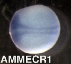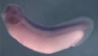 ammecr1 (Alport syndrome, mental retardation, midface hypoplasia and elliptocytosis chromosomal region gene 1 ) gene expression in Xenopus laevis embryos, NF stage 18, as assayed by in situ hybridization, dorsal view, anterior left. |