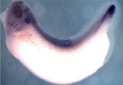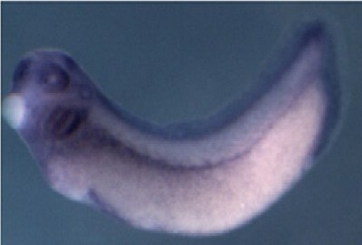 stk3 (serine/threonine kinase 3) gene expression in Xenopus laevis embryos, NF stage 29, as assayed by in situ hybridization, lateral view,dorsal up, anterior left. |