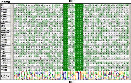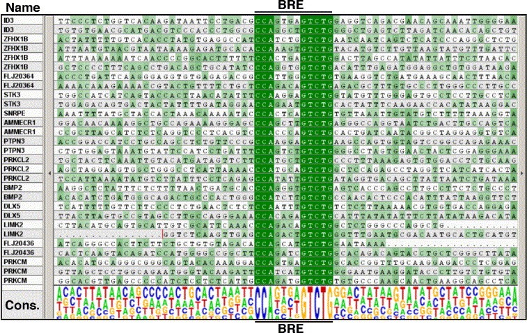 Supplemental Fig. 1. Alignments of candidate BREs among BMP targets. Shown is a screenshot capture of alignments for each BRE-like sequence and the flanking nucleotide sequences from a subset of the genes shown in Table 1. Each BRE-like element found is highlighted in dark green and other regions of homology are denoted by light green. Shown are approximately 30 base pairs of flanking sequence both upstream and downstream of each BRE-like element. Regions without homology are not shaded. For each gene, the nucleotide sequence for every BRE element found and adjacent sequence is shown. A Logo representation of the consensus sequence (Cons.) for the BRE elements and flanking sequence is shown below the alignments (Crooks et al., 2004). Note that, for SNRPE, only one BRE site is shown as this gene has a second BRE site on the complement strand with identical sequence to the other SNPRE site over the range shown.