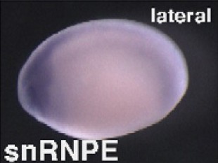snrpe (small nuclear ribonucleoprotein polypeptide E) gene expression in Xenopus laevis embryos, NF stage 18, as assayed by in situ hybridization, lateral view, dorsal up, anterior left. |