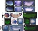 Fig. 7. Expression patterns of Xenopus orthologues to human genes with multiple BREs. Of the 26 representative orthologues from the 80 genes with available annotation in Xenopus, the expression patterns of 19 genes were analyzed by whole mount in situ hybridization. Expression patterns are organized based on the behavior of each gene in the RT-PCR experiments shown in Table 1 (strong, weak, no change, no data, not examined). Not shown are Id3 (Fig. 3) and BMP2 (Nishimatsu et al., 1992). Shown are the patterns at the neurula and tailbud stages for each gene; refer to Table 1 for a description of each pattern at the gastrula stage. Unless otherwise indicated, for neurula stages, anterior is to the left and dorsal is up. For tailbud stages, lateral views are shown. |