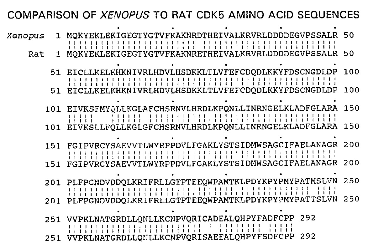 Fig. 3. Comparison of the derived amino acid sequences of X. ~ecis and rat cdk5. Vertical lines indicate identical amino acid residues. The overall amino