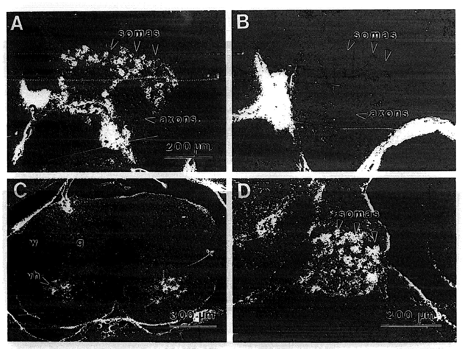 (arrowhead at vh). Axons and glial cells in the white matter (w) fail to show any specific labeling. The apparent labeling surrounding the spinal cord