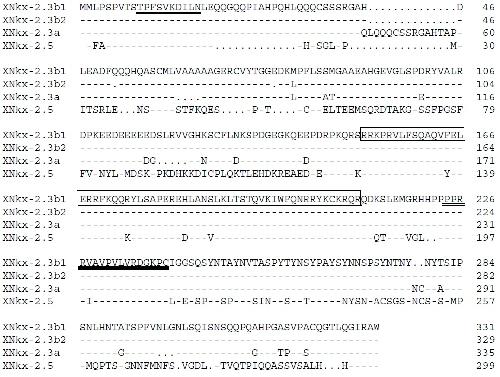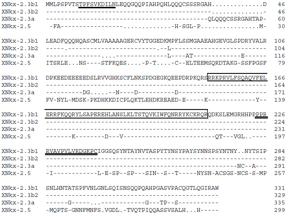 Fig. 3. Predicted amino acid sequences of XNkx-2.3a, XNkx-2.3b1 and XNkx-2.3b2,