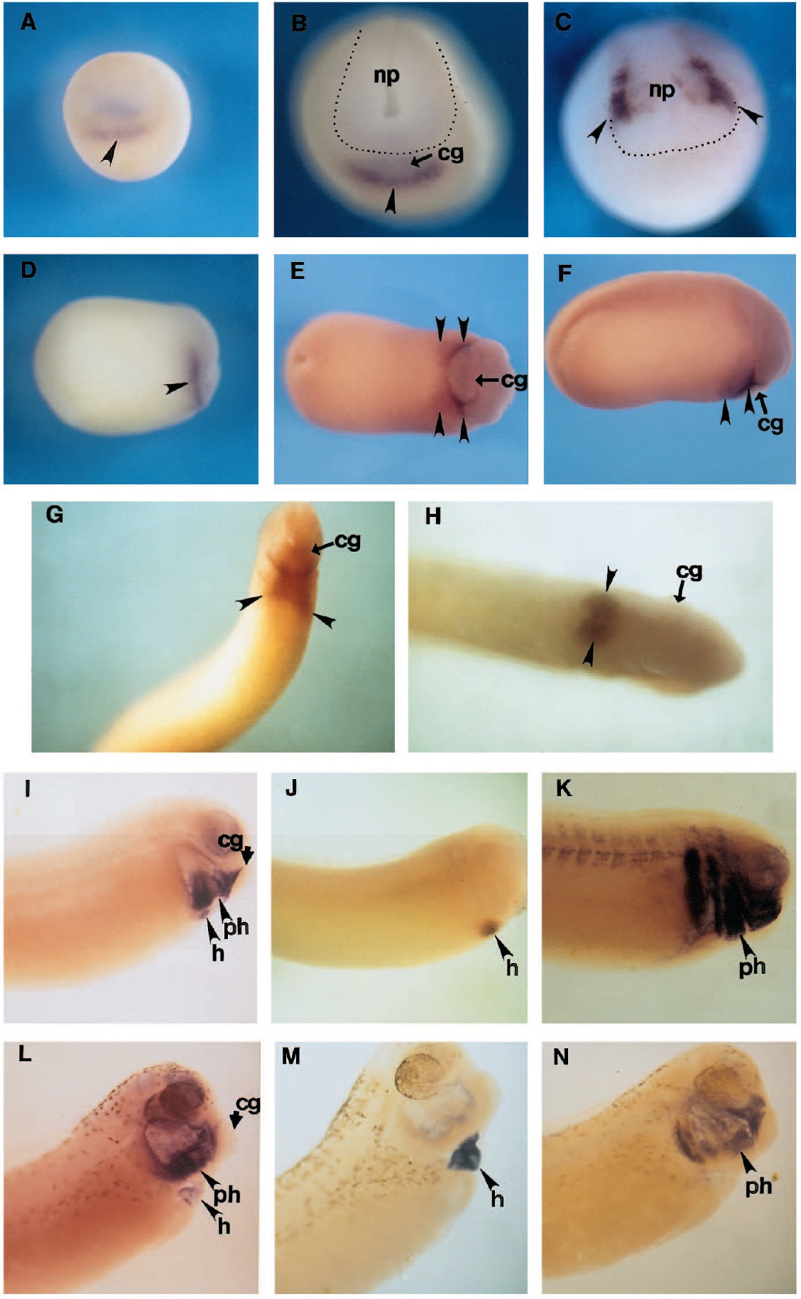 is no staining in the cardiac region. (L) Lateral view of stage 34 embryo, hybridized to probe for XNkx-2.3. Anterior is to the right, dorsal at the