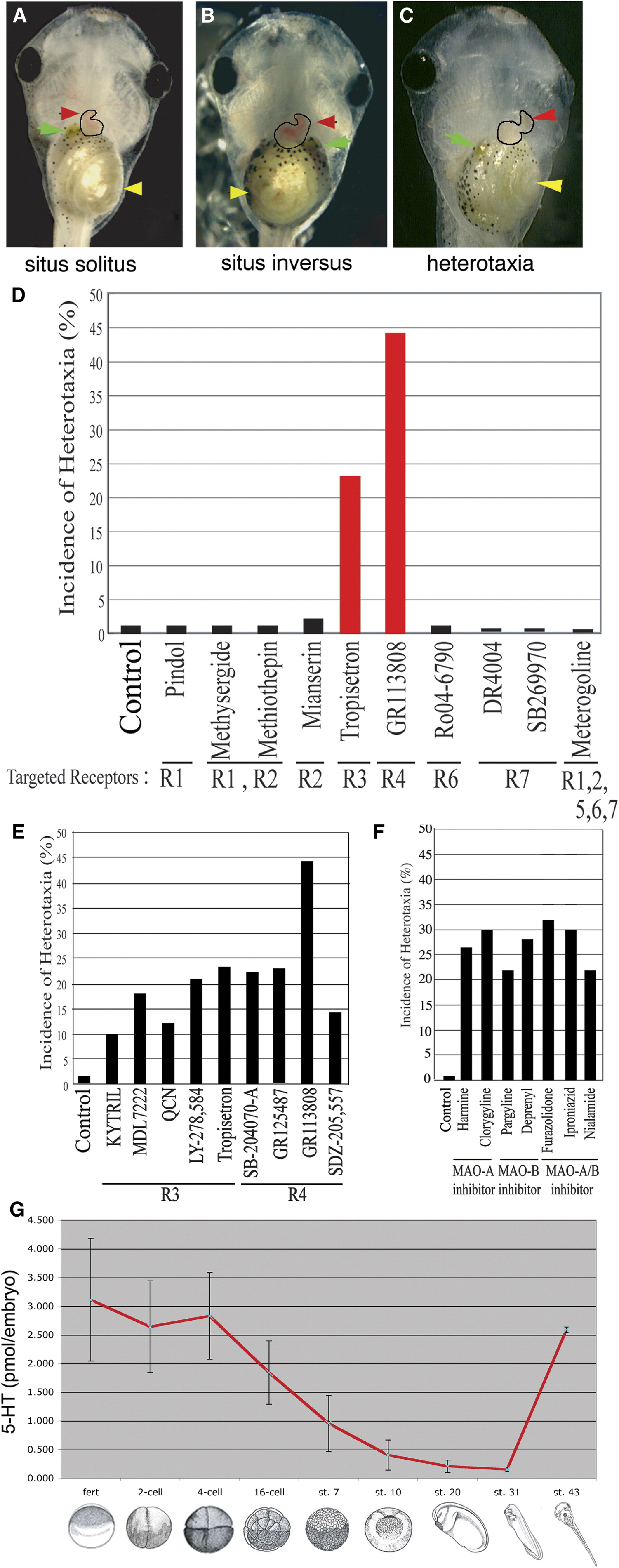 (D) Pharmacological blockers targeting 5-HT receptor types R1–R7 were applied to batches of embryos from fertilization to stage 12. Only blockers of R3 and R4 induced heterotaxia (statistical analysis is presented in Tables S2–S6).