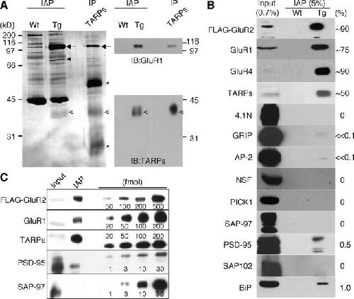 Figure 3. Quantitative association of TARPs with immunopurified AMPARs. (A) Gold colloidal total protein staining of immunoaffinity-purified CBP/FLAG-GluR2 (IAP) and immunoprecipitated TARPs (IP). The same preparations were also analyzed by Western blotting with anti-GluR1 or TARP antibody. The proteins with molecular masses of 110 (arrow), 78 (closed arrowhead), and 35 kD (open arrowhead) were detected in the transgenic mouse (Tg) but not in wild-type (Wt). 110- and 35-kD proteins were also detected in TARPs-IP, which correspond to AMPARs including GluR1 and TARPs, respectively. Asterisks denote the bands of IgG heavy and light chains. (B) IAP elution in A was immunoblotted with the indicated antibodies. The recovery (%) of each protein from input is indicated. (C) Quantitative binding of TARPs with AMPARs. For CBP/FLAG-GluR2, GluR1, and TARPs, input (1%) and purified AMPARs (IAP; 1%) from transgenic mouse brain were analyzed with the indicated amounts of purified CBP/FLAG-GluR2, HA-GluR1, and His6-stargazin COOH terminus. For PSD-95 and SAP-97, input (0.1%) and IAP elution (4%) were analyzed with purified PSD-95-GFP and SAP-97-GFP. These data are representative of five independent experiments.