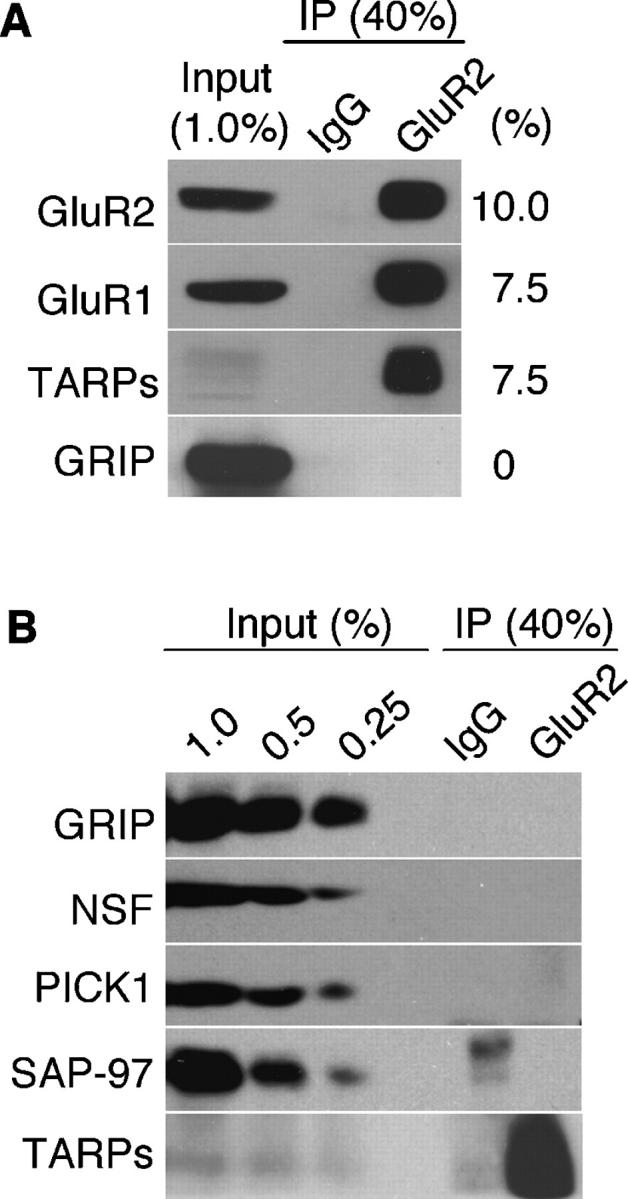 Figure 1. Immunoisolation of AMPARs from wild-type mice. (A and B) Brain extracts solubilized with 1% Triton X-100 were used for immunoprecipitation with anti-GluR2 antibody or nonimmune mouse IgG. AMPAR subunits and previously reported AMPAR binding proteins (see text) were examined by immunoblotting. Input lanes contain the indicated percentage of proteins used for immunoprecipitation (IP). (A) The percentages of binding (%) are indicated.