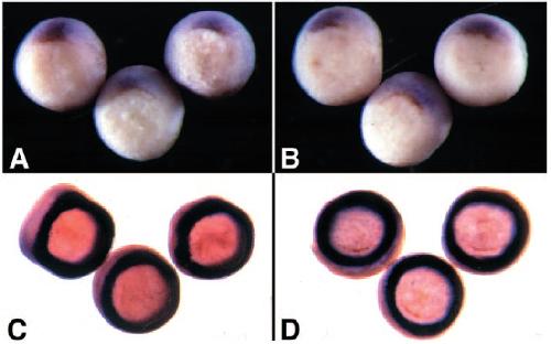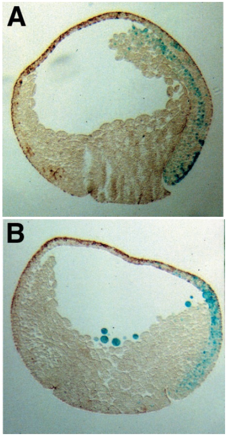 blastocoel and in the marginal zone prior to involution (B). Few X-galstained