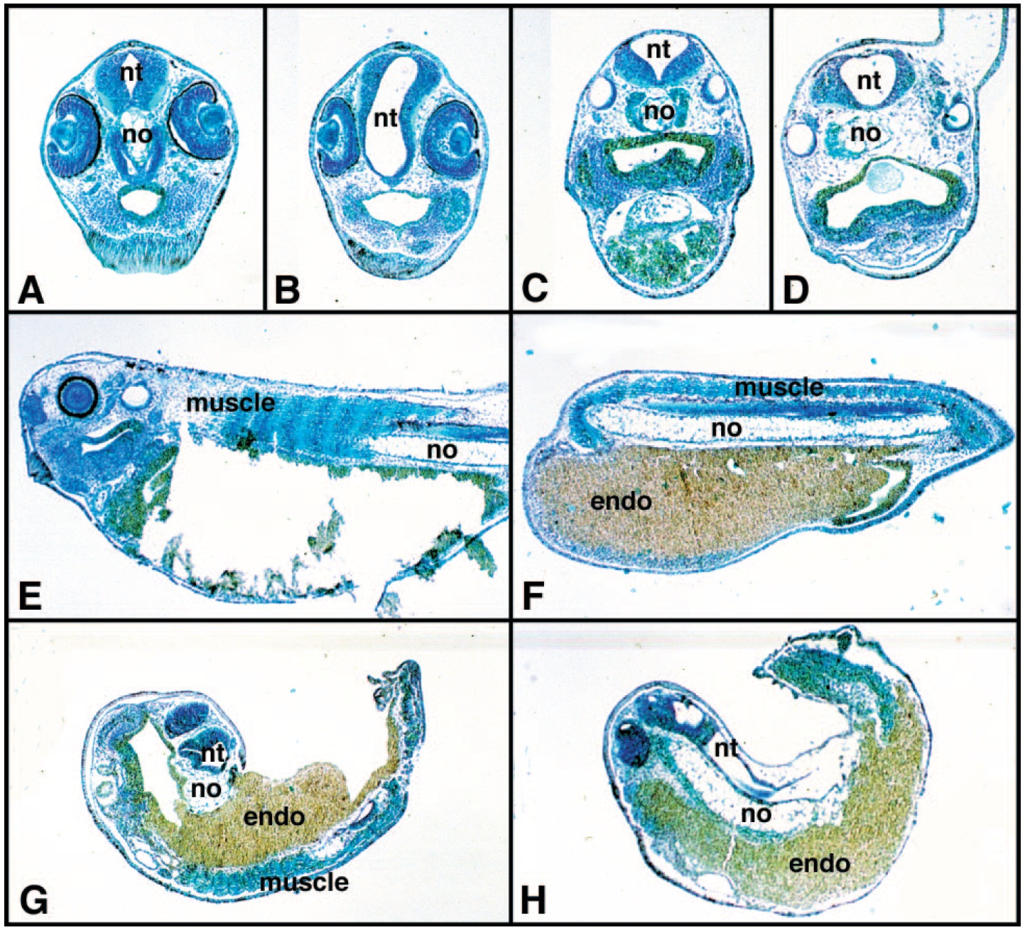 37-injected (B,D) embryos through the level of the eye (A, B) and otic vesicle (C,D). Note absence of notochord (no) in B, and misshapen