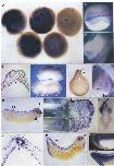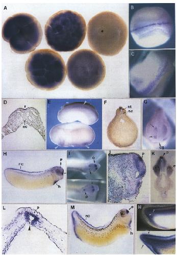 Fig. 3. Whole mount in situ hybridization (BMP-2) of Xenopus embryos. Xenopus albino embryos were hybridized with a digoxygenin labelled BMP- 2 antisense RNA derived from a 737 bp Sac IlPst I fragment and processed as described in Section 4. (A) From left to right: four-cell (st. 4), 32-cell (St. 6). morula (St. 7), blastula (St. 8.5) and gastrula (st. 11.5) stage embryos. Asterisk denotes the blastoporus. (B) Late neurula (St. 19) (dorsal view). (C) St. 21 (dorsal view). (D) Transverse section (30µm) through stage 17 embryo. The arrowhead points at staining in the dorsal midline. (E) St. 22/23 embryos. Arrowheads denote staining in the dorsal midline (upper) and in anterior and posteriormesoderm (lower). (F) Transversal section (100�m) (trunk region) through a St. 24 embryo. (G) St. 24, anterior view. Arrows denote intense staining at two frontal loci. (H) St. 28 embryo. The arrow points at the olfactory placode. (I) St. 28 embryos, frontal view. Note staining of the pineal body and of the olfactory placodes. (J) Parasagittal section through st. 28 embryo. (K) Anterior transversal section (100µm) according to the arrow in (I) through st. 30 embryo. (L) Higher magnification of an anterior transversal section (30µm) showing the mushroom-shaped pineal body and its communication to the third ventricel (arrowhead). (M) St. 32 embryo. (N) Magnification of the tailbud regions of St. 29 (top) and st. 33 (bottom) embryos. The arrows point at the disintegration of neural crest cells. cg: cement gland; e: eye anlage; h: heart anlage; nc: neural crest; no: notochord; nt: neural tube; o: olfactory placode; p: pineal body.