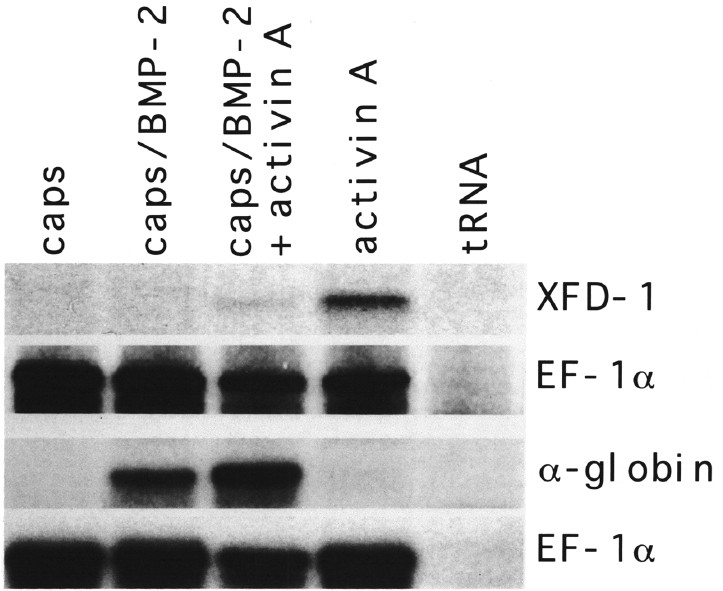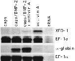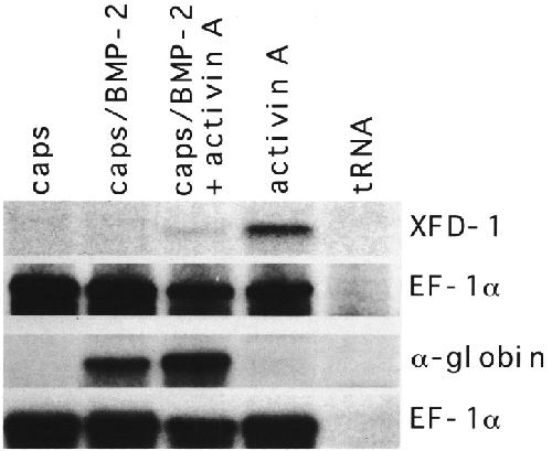 Fig. 7. Analysis of dorsal and ventral marker genes in animal cap explants from BMP-2 injected embryos. Animal caps of uninjected and BMP-2 injected embryos (each 1 ng RNA into the two dorsal blastomeres at the four-cell stage) were dissected at early to midblastula stage and, in part, incubated with 75 ng/ml human recombinant activin A. RNA was collected when control embryos had reached stage 12 or stage 35, respectively. RNA equivalent to each ten caps/lane was analysed by RNase protection for XFD-I or EF-lα transcripts at stage 12 (same probes as described in the legend to Fig. 6) and, at stage 35, for embryonic α-globin transcripts using an antisense probe transcribed from the 252 bp Pst I/Barn HI fragment of pXGL 19.1 (Widmer et al., 1981) or for EF-lα transcripts.