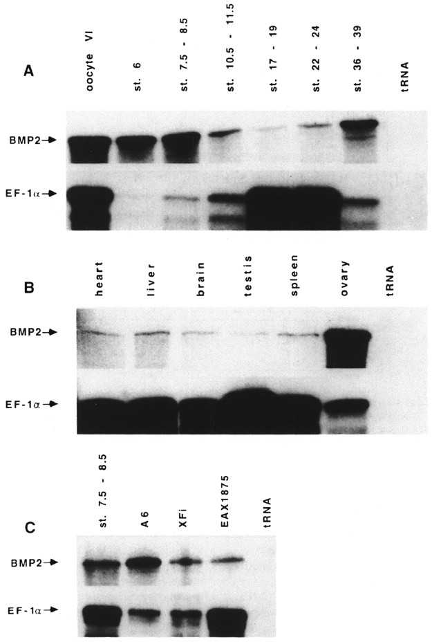 Fig. 2. RNase protection analysis of RNAs from oocytes, embryos, adult tissues and cell lines. Each 30 µg RNA from (A) oocytes (stage VI; classification according to Dumont, 1972) or embryos at different developmental stages (morula: st. 6.5; blastula: St. 8; gastrula: St. 10.5-11.5; neurula: St. 15-16; somite segregation: St. 25; tadpole: St. 37-38; stage classification according to Nieuwkoop and Faber, 1956), (B) from adult tissues as indicated and (C) from three Xenopus cell lines were hybridized with BMP-2 antisense RNA derived from a 401 bp Sac I/Sma I fragment (see also Section 4). Control hybridizations were performed with yeast tRNA. After RNAse digestion, protected fragments were separated on polyacrylamide gels and visualized by autoradiography. Integrity of RNA preparations was checked by RNase protection using an EF-1α antisense probe (Pöting et al., 1990; Krieg et al., 1989).