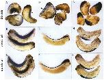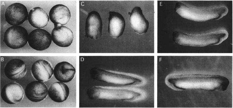 Fig. 4. Phenotype of embryos injected with BMP-2 mRNA. Four-cell stage Xenopus embryos were injected with each 1 ng of in vitro transcribed mRNA into the two dorsal or ventral blastomeres. They were allowed to develop until uninjected control embryos had reached stage 17 or stage 32 to 34, respectively. (A) Stage 17 embryos, injected with BMP-2 mRNA into the dorsal blastomeres; (8) stage 17 embryos, uninjected; (C) stage 33 embryos, injected with BMP-2 mRNA into the dorsal blastomeres; (D) stage 33 embryos, injected with BMP-2 mRNA into the ventral blastomeres; (E) stage 33 embryos, injected with BMP-2delta Pst I mRNA into the dorsal blastomeres; (F) stage 33 embryo, injected with human globin mRNA into the dorsal blastomeres.