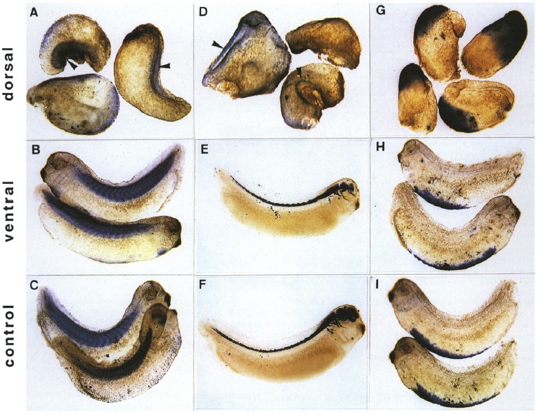 Fig. 5. Transcription of dorsal and ventral marker genes in embryos overexpressing BMP-2. Each 1 ng of in vitro transcribed BMP-2 mRNA was injected either into the two dorsal or into the two ventral blastomeres of four-cell stage Xenopus embryos. When uninjected embryos (control) had reached stage 32 to 35, the embryos were fixed and analysed by whole mount in situ hybridization. (A-C): α-Cardiac actin α1 (Stutz and Spohr, 1986); (D-F): class II Ã-tubulin (Richter et al., 1988, Good et al., 1989); (G-I): embryonic α-globin (Widmer et al., 1981). Embryos were bleached and cleared in benzylbenzoate/benzyI alcohol (2:l). Arrowheads in (A) or (D) point towards residual α-actin Ã-tubulin transcripts, respectively.