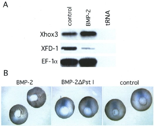 Fig. 6. Xhox3 and XFD-I transcription in embryos injected with BMP-2 mRNA. Xenopus embryos at the four-cell stage were injected with each 1 ng of BMP-2 mRNA or BMP-2delta Pst I mRNA into the two dorsal blastomeres. (A) Total RNA (equivalent of 5 embryos) of BMP-2 injected (BMP-2) or uninjected embryos (control) at stage 12 was analysed by RNase protection with antisense RNA transcribed from a 750 bp Eco RI fragment of Xhox3 (Ruiz i Altaba and Melton, 1989a, 1989b). a 484 bp Eco RI/Bgl II fragment of XFD-1 (Kn6chel et al., 1992) or a 311 bp Pvu II/Pst I fragment of EF-lα (pXEF7, P�ting et al., 1990). Yeast tRNA was used as control. (B) Embryos were fixed at stage 11. Whole mount in situ hybridization was performed with antisense RNA transcribed from a 484 bp Eco RI/Bgl II fragment of XFD-1.