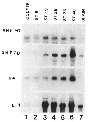 and hybridized with whole xnf7 cDNA probe. Ethidium bromide staining (bottom) shows equal amounts of RNA loaded into each lane of the