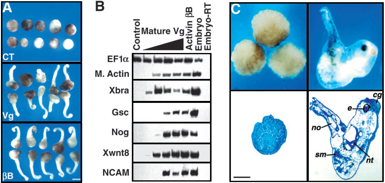 of mature Vg1 and cultured to the late tadpole stage (stage 40), differentiated into embryoids displaying a rudimentary axial organization, with
