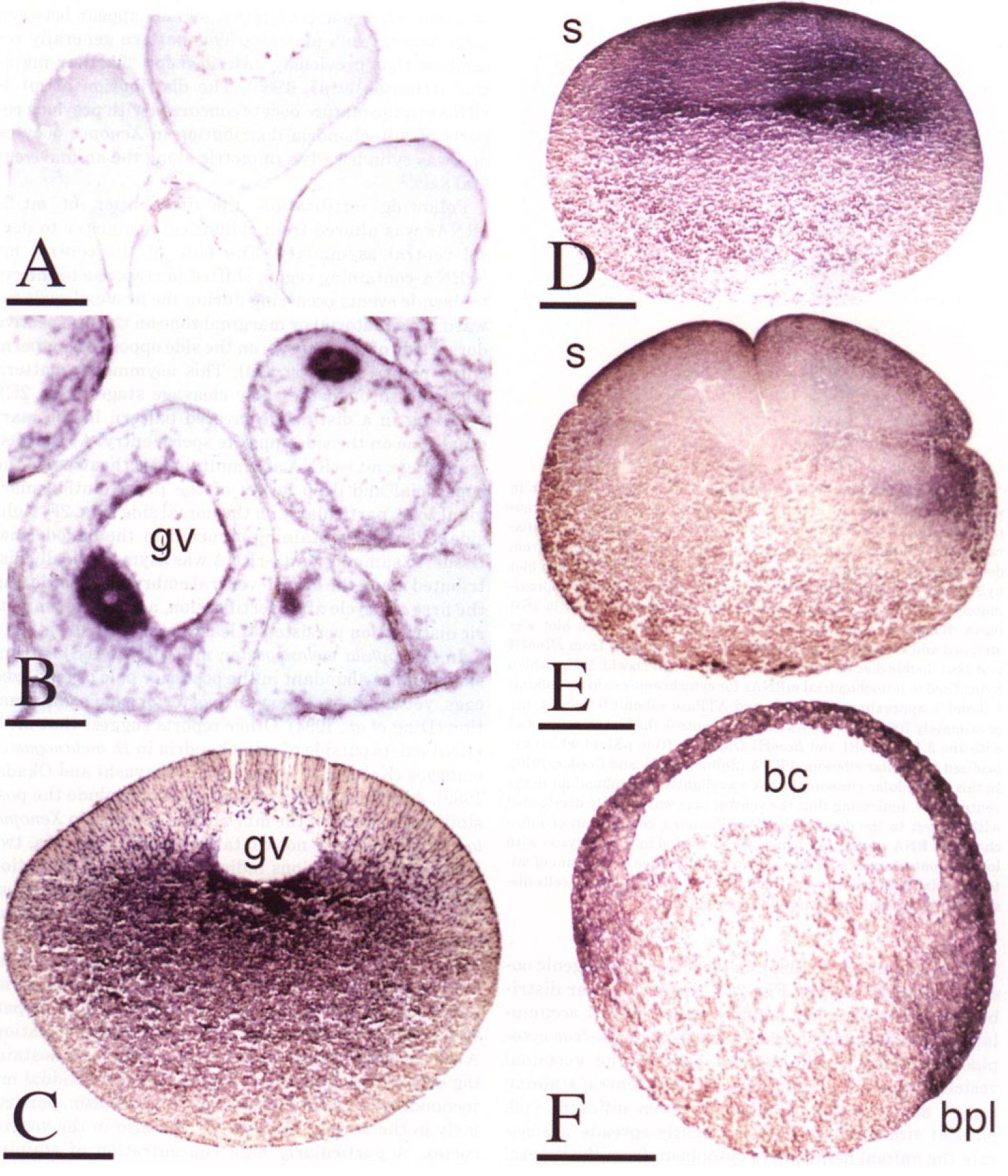 gastrula (stage 10). Dorsal lip of the blastopore is on the lower right marginal zone. Scale bars in A, B, 50 Jlm; C-F, 250 .urn. gv, germinal vesicle;