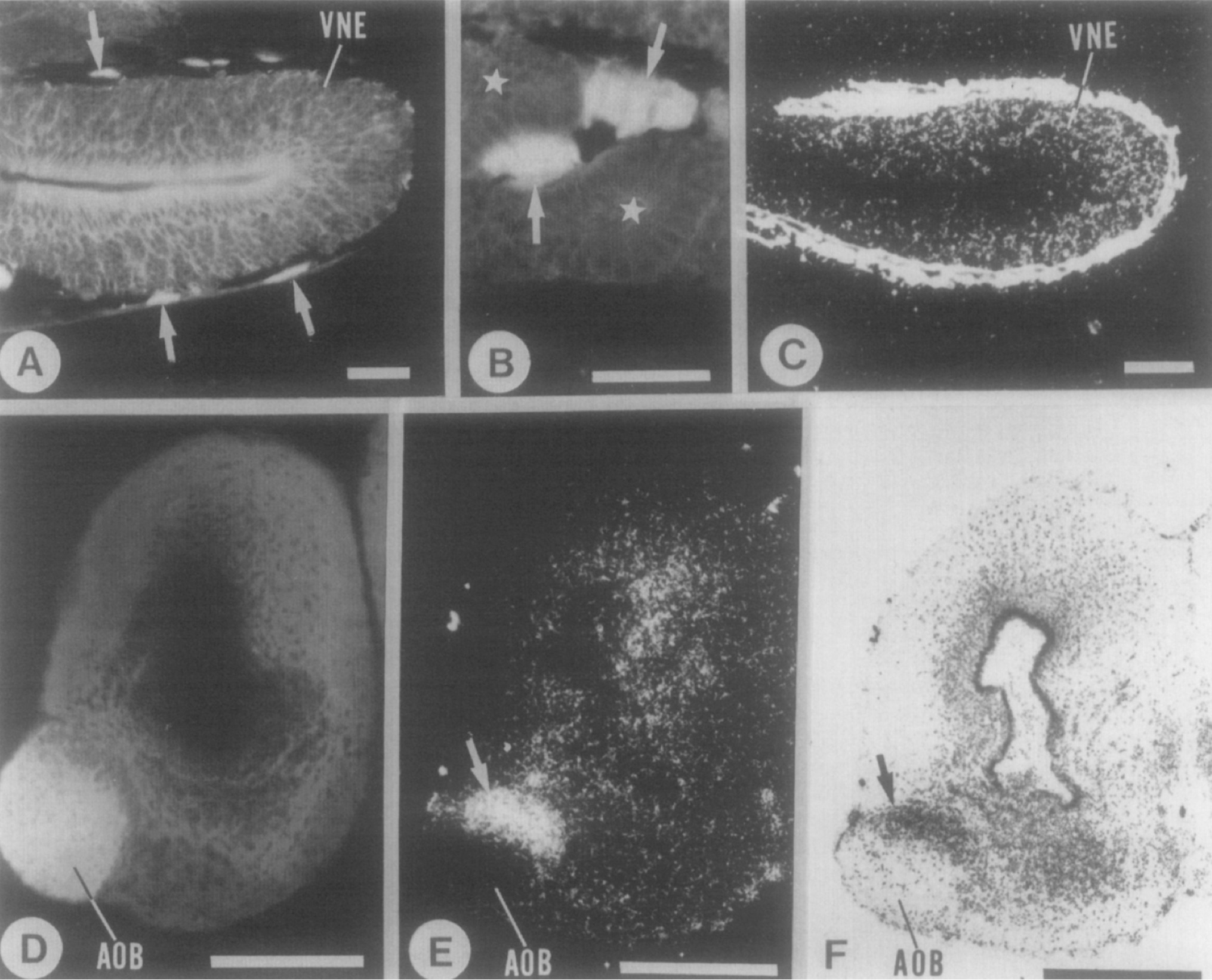 (C, E, and F) Localization of the plexin mRNAs,as detected by in situ hybridization.(C) and (E) show dark-field micrographs;(F) shows a bright-field micrograph of (E). In situ hybridization signals are detected in the epithelial cells of the vomeronasal organ (VNEin [C]) and the target neurons for the vomeronasal nerve fibers (arrows in [E] and [F])within the accessory olfactory bulb (AOB). Asterisks in [B] indicate the Bowman's glands. All images are at stage51. Bars, 100 rim (A-C); 200 pm (D-F).