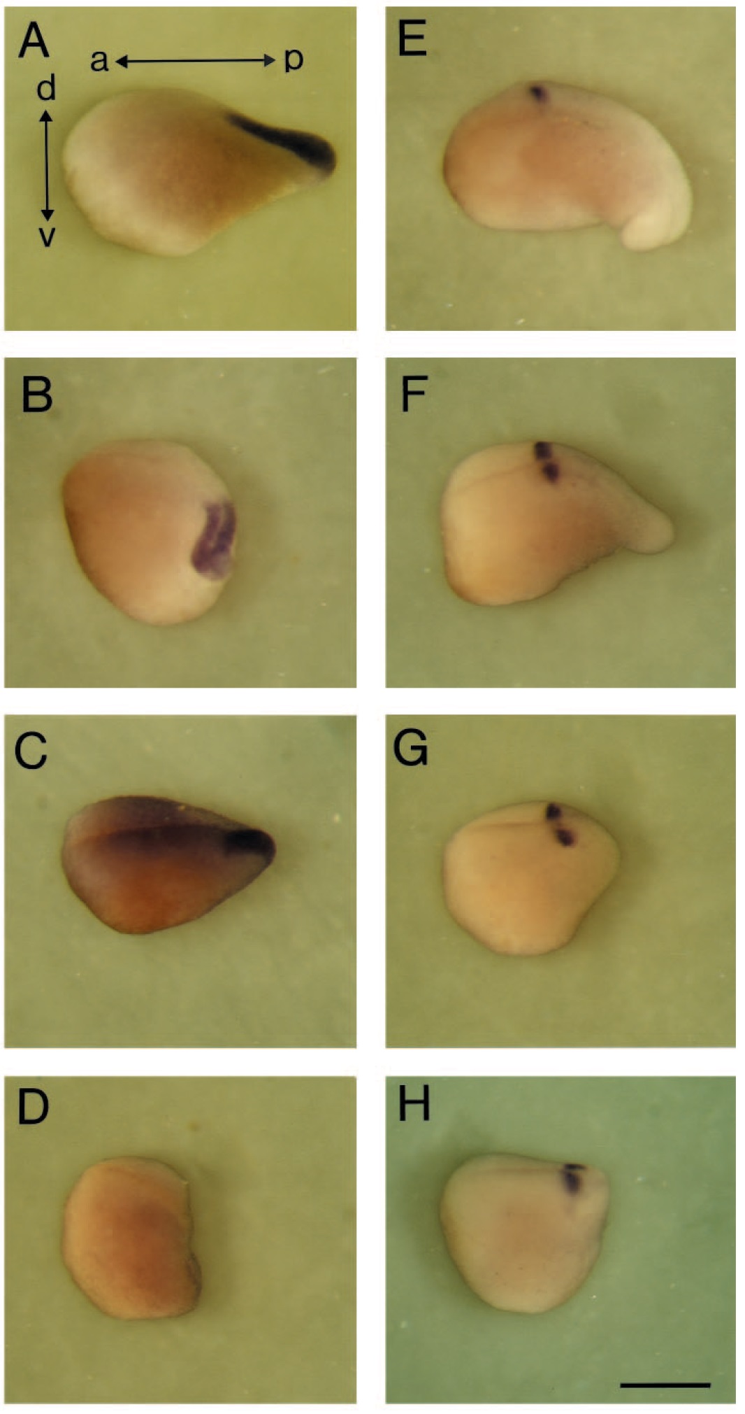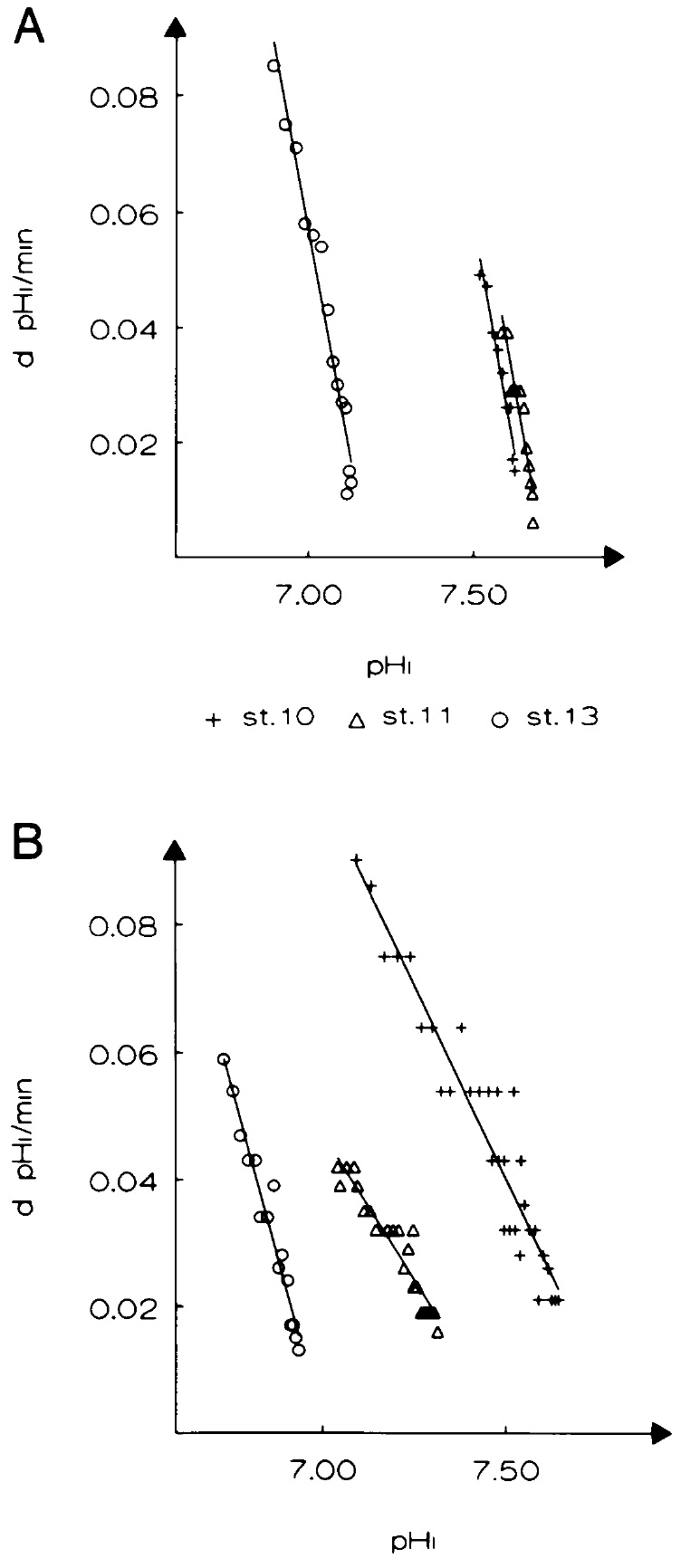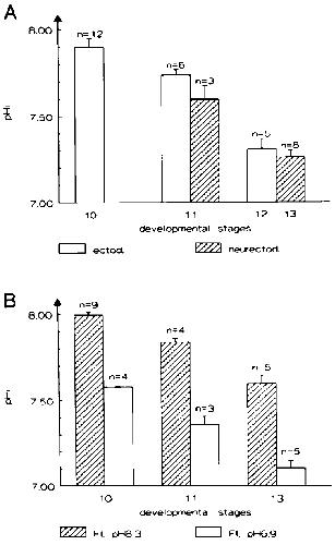 There is evidence suggesting that pHi elevation can induce differentiation to cement gland, an extremely anterior structure, during the early development of Xenopus laevis (Picard, J. J. (1975) J. Embryol. exp. Morphol. 33, 957-967; Sive, H. L., Hattori, K. and Weintraub, H. (1989) Cell 58, 171-180). We wanted to investigate whether axial development or neural induction are mediated in Xenopus via regulation of pHi. Our interest was stimulated further because certain signal transduction pathways, which are thought to mediate anterior neural induction (Otte, A. P., Van Run, P., Heideveld, M., Van Driel, R. and Durston, A. J. (1989) Cell 58, 641-648; Durston and Otte (1991), Cell-Cell Interactions in Early Development, pp. 109-127), are also known to modify the activity of proton extruders (Mitsuka and Berk (1991) Am. J. Physiol. 260, C562-C569; Wakabayashi, S., Sardet, C., Fafournoux, P., Counillon, L., Meloche, S., Pages, G. and Pouysségur, J. (1993) Rev. Physiol. Biochem. Pharmacol. Vol. 119, pp. 157-186). We therefore measured pHi in explants of gastrula ectoderm and neurectoderm and identified ion exchangers that regulate pHi in these tissues. The measurements showed that pHi decreases in explants of both neurectoderm and uninduced ectoderm during the time course of gastrulation, this pHi decrease thus fails to correlate with neural induction. One important regulator of this cytoplasmic acidification is the Na+/H+ exchanger. The pHi set point, at which the acid extrusion activity of this alkalizing exchanger is shut off, shifts to more acidic values during the time course of gastrulation, thus permitting cytoplasmic acidification. We found also that preventing cytoplasmic acidification and thereby elevating pHi in late gastrula cells led to the specific suppression of posterior development. Neural induction and anterior development were unaffected by treatments leading either to an elevation of or a decrease in pHi. These findings indicate that the cellular processes mediating anterior development and neural induction are pHi tolerant, while the signals mediating posterior development require a sustained pHi decrease for their action, suggesting that downregulation of pHi is necessary for posterior axial development.