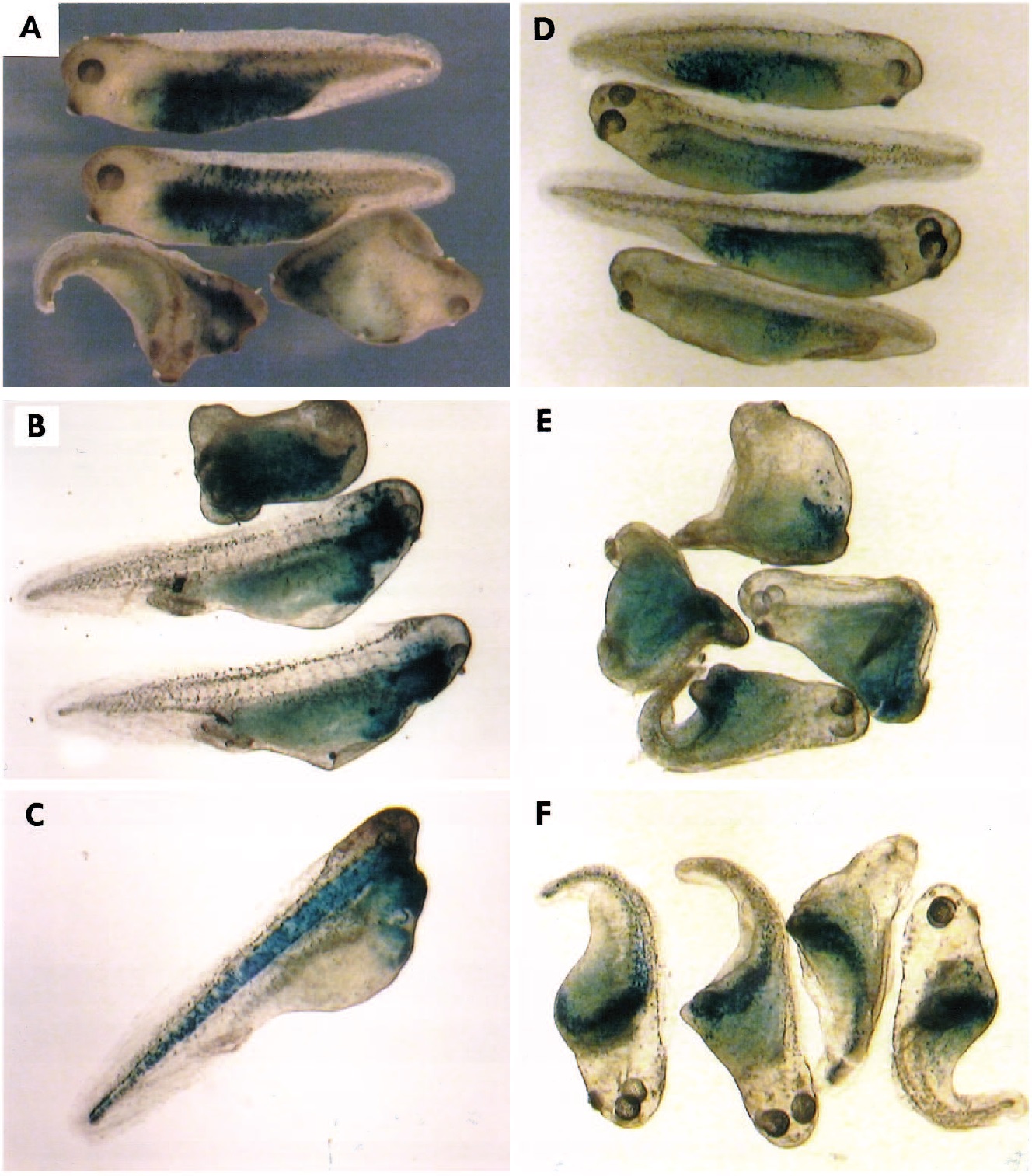 Fig. 3. The effect of Xdsh mRNA depends on the site of injection. A single prospective dorsal (A) or ventral (B,D) vegetal blastomere of
