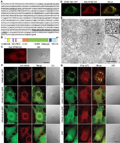 Figure 1. RNG105 is a novel protein with an RNA-binding motif and promotes the organization of cytoplasmic granules containing ribosomes and mRNAs. A, Predicted amino acid sequence of XRNG105. Solid line, Coiled-coil domain; dotted line, NLS; double line, nuclear export signal (NES); wavy line and bold letters, RGG box, an RNA-binding motif. B, Schematic diagram of XRNG105. E-rich, Glutamic acid-rich region; Q-rich, glutamine-rich region; RG-rich, arginine- and glycine-rich region. Other regions are described in A. C, Immunostaining of A6 cells with anti-XRNG105 antibody. Right, Differential interference contrast (DIC) image. Scale bar, 10 μm. D, A6 cells expressing XRNG105-GFP were stained with anti-XRNG105 antibody. Scale bar, 10 μm. Merge, Merged images. E, Immunoelectron microscopy of A6 cells expressing XRNG105-GFP stained with anti-XRNG105 antibody. Spots of immunogold (black arrowheads) are seen in a ribosome-rich area (â¼1 μm in diameter) in the cytoplasm. White arrowheads denote ribosomes (inset). Scale bar, 500 nm. F, G, A6 cells expressing XRNG105-GFP, XRNG105δC-GFP, XRNG105δN-GFP, and GFP were stained with anti-RPS6 antibody (F) or stained by in situ hybridization with poly(dT) for mRNA detection (G). The right panels are DIC images. Scale bar, 10 μm. |