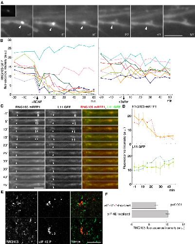 Figure 6. Dissociation of RNG105 from the RNA granules by BDNF stimulation. A, Time-lapse imaging of RNG105-GFP in the dendrites of cultured hippocampal neurons. The time after BDNF treatment is indicated. Arrowheads denote an RNG105-localizing RNA granule, the localization of which was stationary during the imaging period. Enhanced images are shown, and the inset is the original image of the same magnification. Scale bar, 5 μm. B, Left, Profile of RNG105-GFP fluorescence intensity in the granule during the experiment in A. Results obtained from eight granules are shown. RNG105-GFP fluorescence intensity was reduced in the granules, except for those near the cell bodies (pale blue and pink). Right, Control experiments with buffer (PBS) treatment. C, Time-lapse imaging of RNG105-mRFP1 and ribosomal L11-GFP in the dendrites. The time after BDNF treatment is indicated. Arrowheads and arrows denote RNG105-localizing RNA granules, the locations of which were unchanged during the experiment. At the arrowhead and the left arrow, RNG105-mRFP1 signals were significantly reduced after 25 and 15 min, respectively. In contrast, L11-GFP signals at the positions were rather constant during the experiment. Scale bar, 5 μm. D, Fluorescence intensities of RNG105-mRFP1 and L11-GFP in the granule denoted by the arrowheads in C were plotted (dashed lines). Results obtained from eight granules are shown as solid lines (means ± SE). E, F, Rat hippocampal slices were immunostained with anti-RNG105 antibody (E, left) and costained with antibody to phosphorylated eIF-4E (eIF-4E-P; E, middle). Although the slices were not treated with BDNF, some areas were stained with anti-eIF-4E-P antibody, which may be because these areas had been activated when the animals were alive. Dendritic areas are shown. RNG105 fluorescence in the granules in which eIF-4E-P was localized was relatively faint compared with that in other RNA granules. F, Fluorescence intensity of RNG105 in the eIF-4E-P-localizing granules was measured and compared with that in the eIF-4E-localizing granules. a.u., Arbitrary units. Scale bar, 10 μm. Error bars represent SEM. |