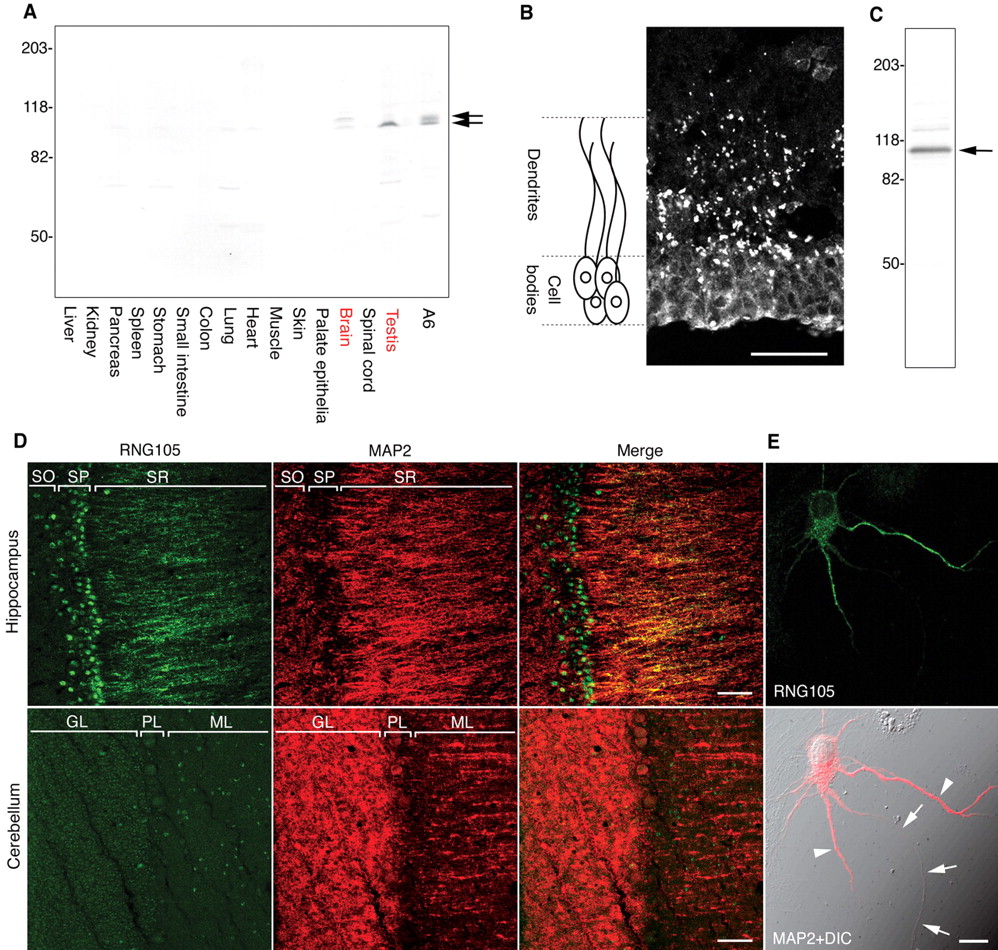 Figure 2. RNG105 is highly expressed in dendrites of hippocampal neurons. A, Western blotting of extracts (30 μg each) from Xenopus tissues and A6 cells with anti-XRNG105 antibody. Arrows denote XRNG105. In brain and A6 cells, XRNG105 was detected as doublets, although the reasons for this are not known. B, Immunostaining of slices from the lateral pallium of Xenopus forebrain with anti-XRNG105 antibody. A schematic drawing is shown on the left. Scale bar, 50 μm. C, Rat brain extracts were immunoblotted with an antibody directed against mammalian RNG105. Arrow, RNG105. D, Slices from rat hippocampus (top) and cerebellum (bottom) were immunostained with anti-RNG105 antibody (green) and costained with anti-MAP2 antibody, which locates dendrites (red). RNG105 was concentrated in the dendritic region of the stratum radiatum (SR) and in the nuclei of pyramidal neurons [stratum pyramidale (SP)] in the hippocampus. In contrast, RNG105 was not detectable in the dendrites of Purkinje cells in the molecular layer (ML) of the cerebellum. Merge, Merged images; SO, stratum oriens; GL, granule cell layer; PL, Purkinje cell layer. Scale bars, 50 μm. E, Rat cultured hippocampal neurons were immunostained with anti-RNG105 antibody (top) and costained with anti-MAP2 antibody (bottom). Bottom, Composite with a differential interference contrast (DIC) image. Arrowheads indicate dendrites; arrows indicate an axon. Scale bar, 10 μm. |