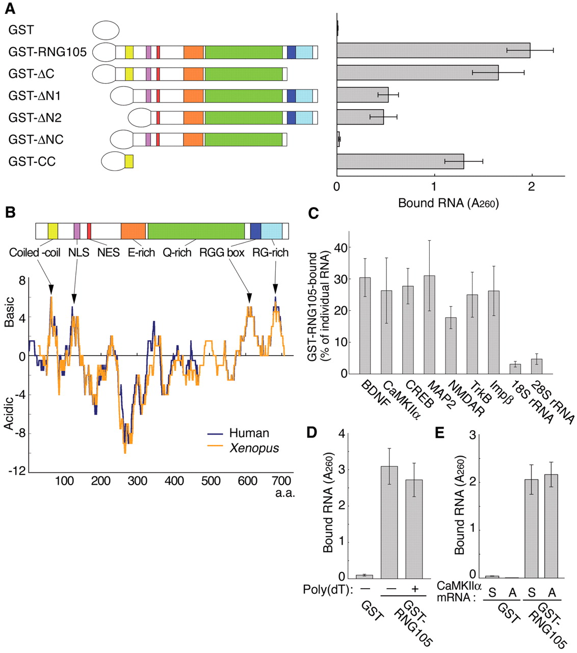 Figure 4. RNG105 binds directly to mRNAs in vitro. A, Recombinant GST-RNG105 deletion mutants were incubated with RNAs isolated from rat hippocampus. RNAs bound to the recombinant proteins were extracted and quantified. δC, Deletion of C terminus (from RGG box to C-end); δN1, deletion of N terminus (from N-end to coiled-coil region); δN2, deletion of N terminus (from N-end to NLS); δNC, deletion of N and C termini (from N-end to coiled-coil region and from RGG box to C-end); CC, coiled-coil region. B, Acidity-basicity analysis of human and Xenopus RNG105. Scores of +1, +0.5, and -1 were given to Lys and Arg, His, and Asp and Glu, respectively. The sum of the scores of 21 aa (residues X -10 to X +10) is plotted against a residue number X. Arrows denote clusters of basic residues. NES, Nuclear export signal. C, Indicated RNAs bound to GST-RNG105 in A were analyzed by semiquantitative RT-PCR. The ratio of the GST-RNG105-bound RNA compared with the input amount of the RNA is shown. Impβ, Importin β. D, Recombinant proteins were incubated with the hippocampal RNAs in the presence or absence of poly(dT), and RNAs bound to the recombinant proteins were quantified. E, Recombinant proteins were incubated with sense (S) or antisense (A) CaMKIIα mRNA, which had been transcribed in vitro. Bound RNA was quantified. Error bars represent SEM. |