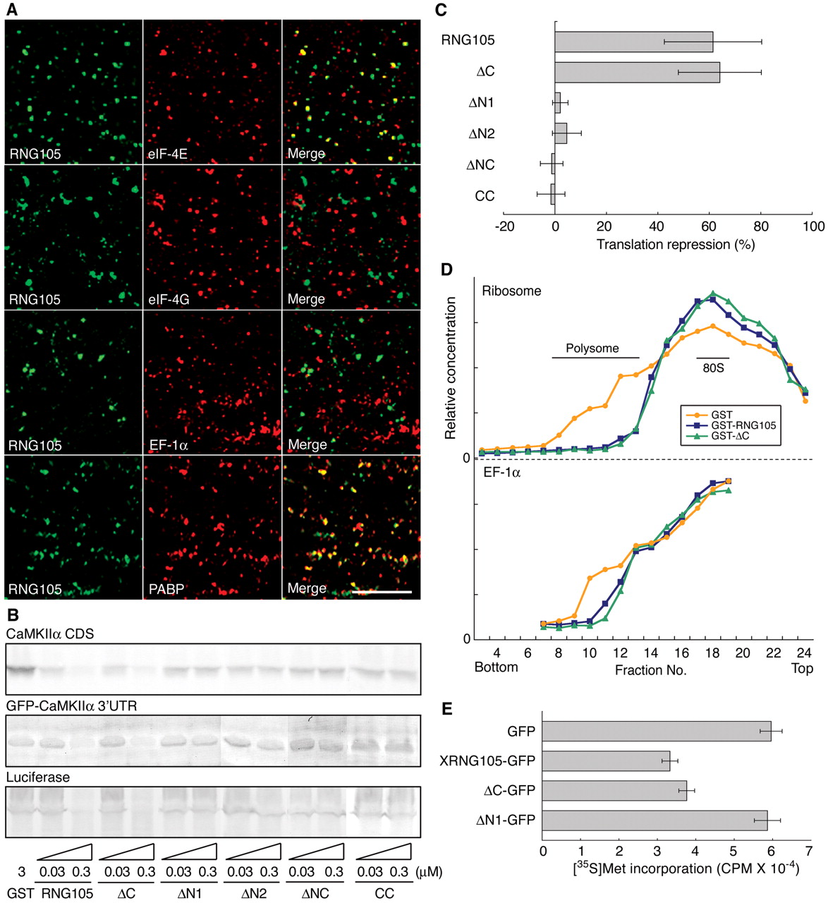 Figure 5. The RNA granule is translationally arrested, and RNG105 negatively regulates translation. A, Rat hippocampal slices were immunostained with anti-RNG105 antibody (green) and costained with anti-eIF-4E, anti-eIF-4G, anti-EF-1α, or anti-PABP antibody (red). Dendritic areas are shown. Merge, Merged image. Scale bar, 10 μm. B, RNG105 inhibits translation in vitro. The CaMKIIα CDS, GFP-CaMKIIα 3â²UTR, and luciferase mRNAs were translated in the presence of indicated recombinant proteins in rabbit reticulocyte lysates and detected by SDS-PAGE. CC, Coiled coil. C, The bands in B were quantified, and translational repression activity of each recombinant protein (0.3 μM) was calculated. Data are means ± SE of translational repression of the three mRNAs by the recombinant proteins. D, The lysates incubated with the recombinant proteins (0.3 μM) in B were fractionated by sucrose density gradient centrifugation. Elution profiles of ribosomes and EF-1α are shown. E, RNG105 inhibits translation in vivo. A6 cells expressing XRNG105-GFP, δC-GFP, δN1-GFP, or control GFP were labeled with [35S]methionine for 10 min and then proteins were isolated from the cells by TCA precipitation. Incorporation of [35S]methionine ([35S]met) into newly synthesized proteins is shown. CPM, Counts per minute. Error bars represent SEM. |