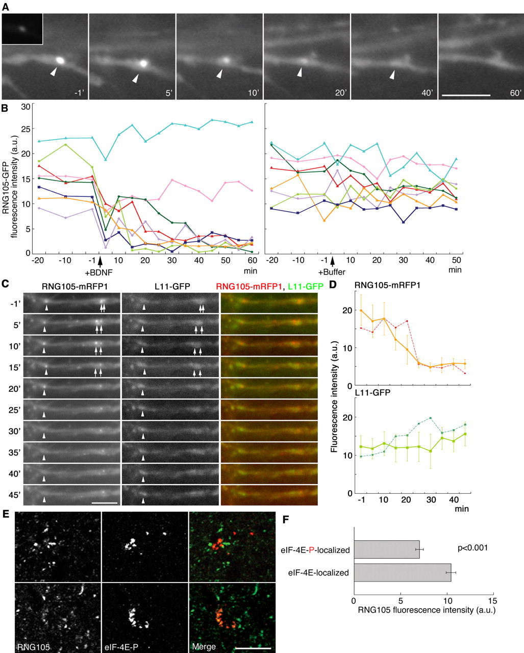 Smart, BDNF induces translocation of initiation factor 4E to mRNA granules: evidence for a role of synaptic microfilaments and integrins. 2003, Pubmed