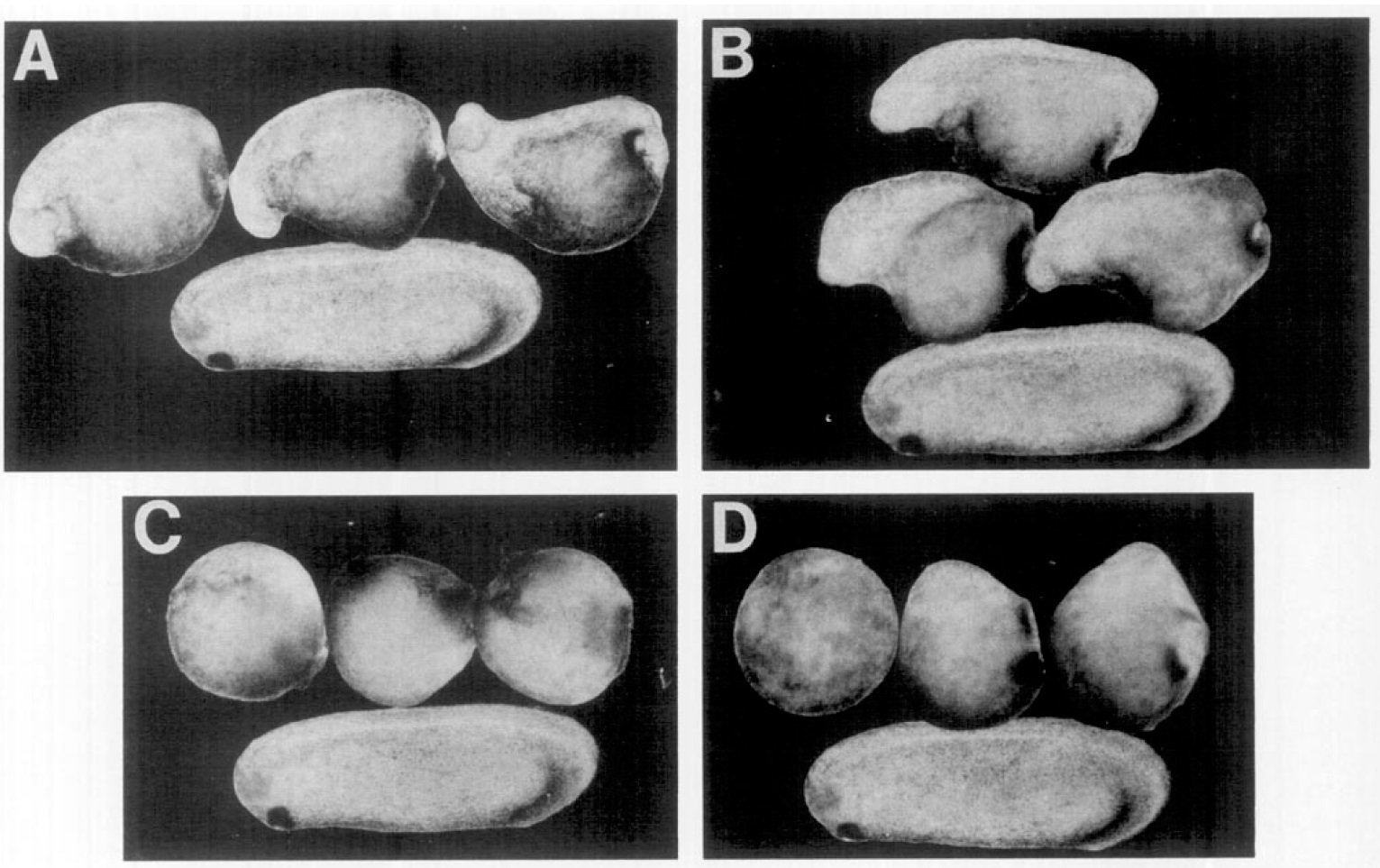 or the two ventral (Band D) blastomeres with 2 ng (A and B) or 4 ng (C and D) of BMP-4 RNA. In each panel, the top three embryos were