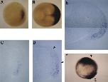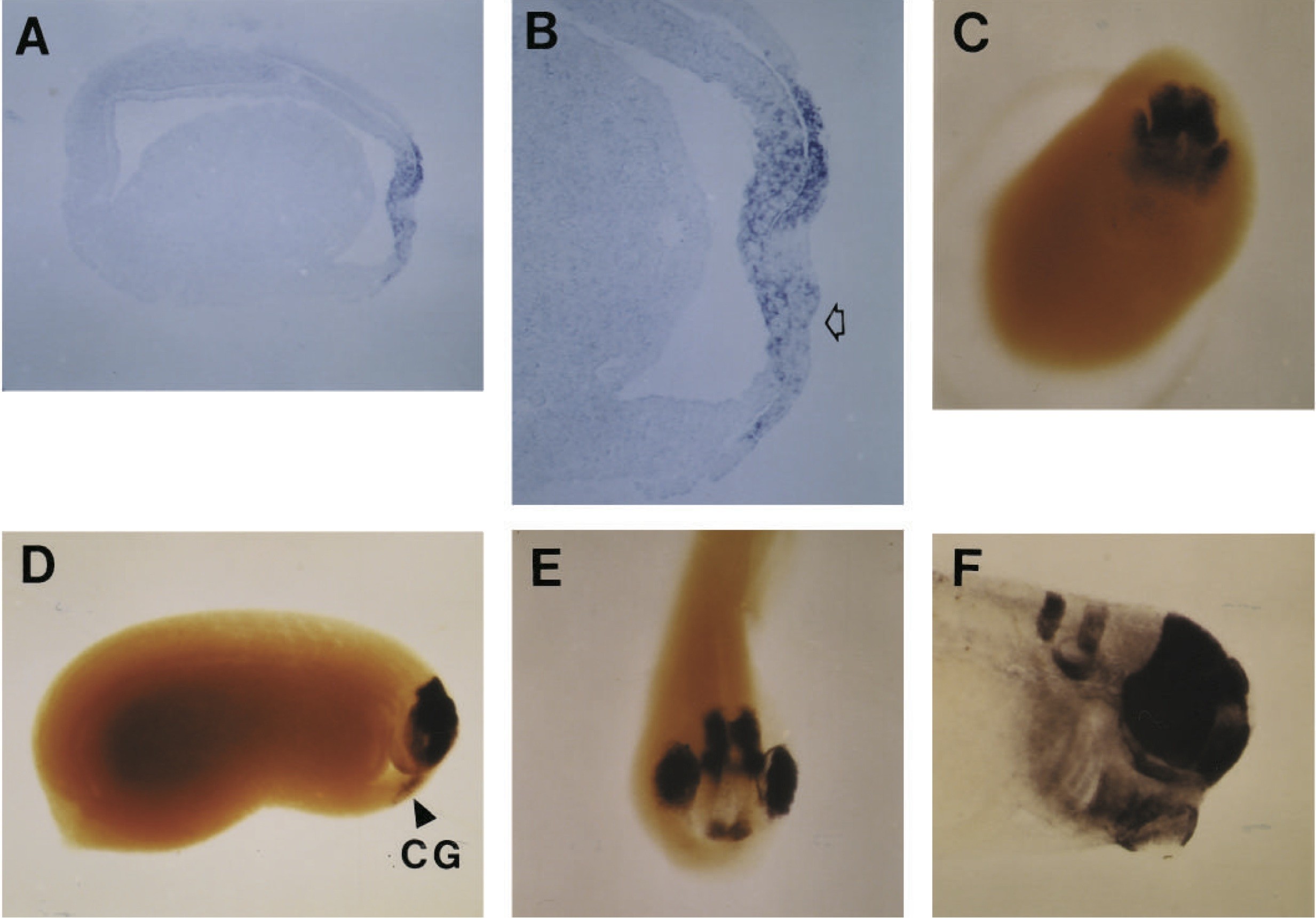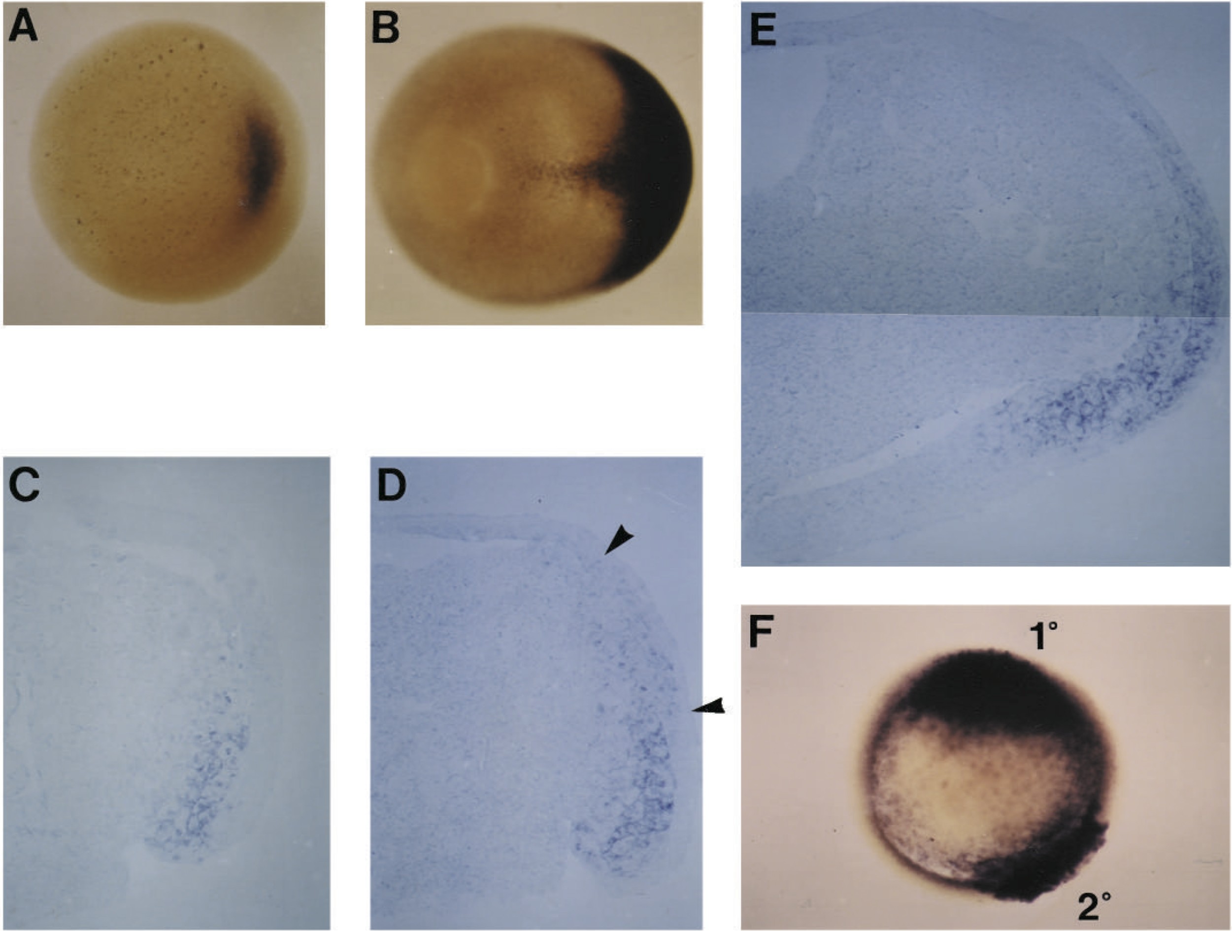 Fig. 3. Whole-mount in situ hybridization of Xotx2 during Xenopus gastrulation. (A) Vegetal view of a stage 10 embryo. (B) Dorsovegetal view of a stage 12 embryo. (C-E) Dorsal portion of midsagittal sections of whole-mount in situ hybridized stage 10+, 10.25, and 12 embryos, respectively. Anterior is to the right in all panels except F. Xotx2 staining in C is confined to deep mesoderm, while in D and E the expression in ectoderm is apparent (arrowheads in D indicate a region of nuclear ectodermal Xotx2 staining). In E Xotx2 expression in both ectoderm and mesoderm are approximately in register. Note the ectodermal thickening marking the presumptive anterior neurectoderm (arrow). The anterior border of ectodermal staining extends further anteriorly into presumptive cement gland (see also Jamrich and Sato, 1989). (F) Xotx2 is induced in ventrolateral mesoderm expressing goosecoid. Single C-tier blastomeres were coinjected with goosecoid RNA and the lineage tracer LRD at the 32-cell stage. At the early gastrula stage, embryos containing LRD at a position greater than 120° away from the dorsal midline were subjected to whole-mount in situ hybridization for Xotx2. A vegetal pole view is shown and the primary and secondary sites of Xotx2 expression are indicated.