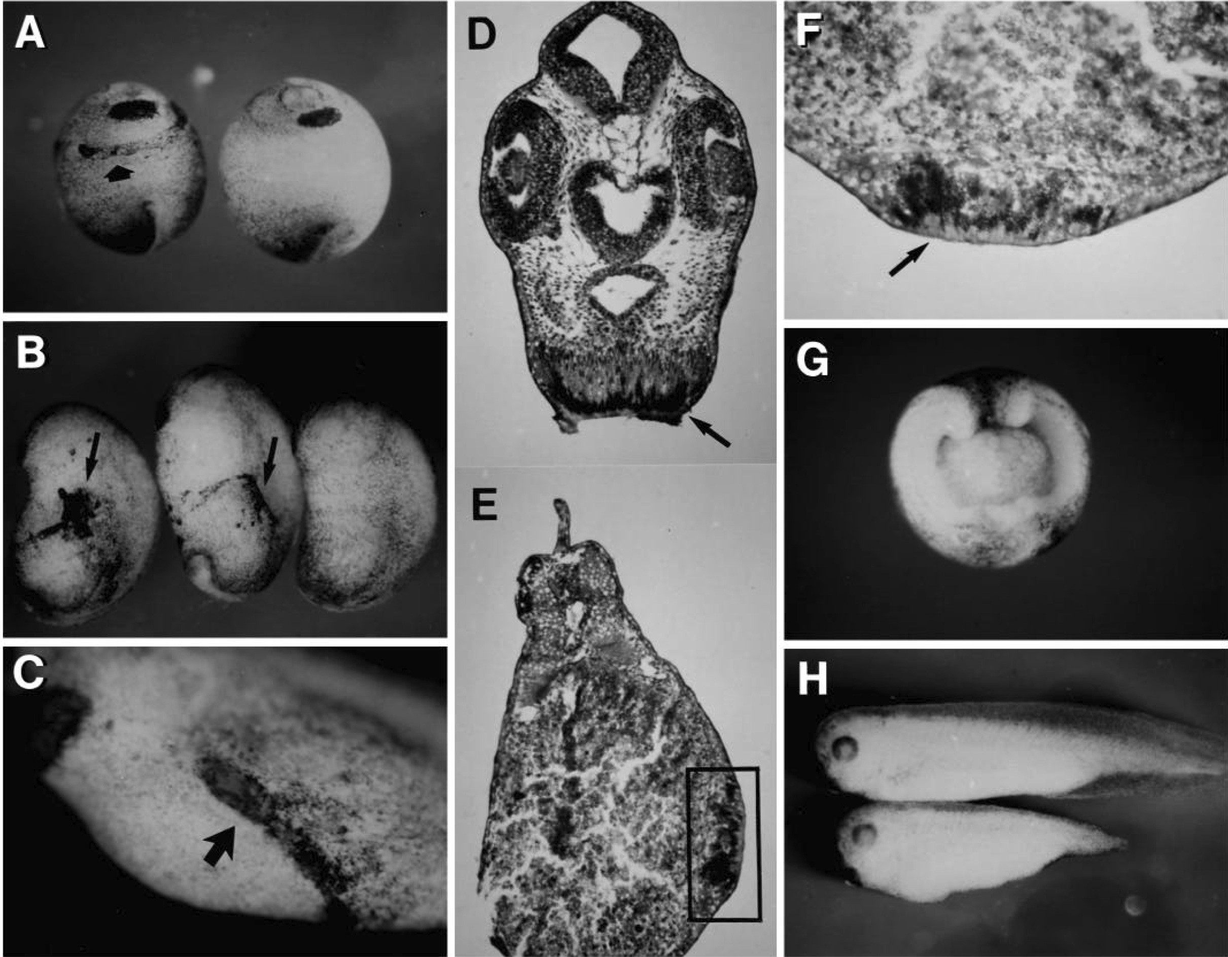 Fig. 5. Ectopic expression of Xotx2 induces ectopic cement glands in the skin of developing embryos. (A) Xotx2 injected (left) and uninjected (right) embryos (stage 20). Note the induction of ectopic cement gland (arrow). (B) Xotx2-injected embryos (stage 22) are left and middle, and an uninjected embryo is right. Arrows indicate ectopic cement glands. (C) Xotx2-injected embryo grown until early tadpole stage. An ectopic cement gland is present in the ventral/lateralectoderm. (D) Transverse section through head of normal tailbud stageembryo. Note that the normal cement gland shows characteristic columnar cells with dark pigmentation (arrow). (E) Transverse section through the trunk of an Xotx2- injected embryo. Box indicates the area of an ectopic cement gland. (F) High magnification view of the boxed area in E. Note the presence of characteristic columnar cells associated with pigment granules (arrow). (G) Incomplete blastopore closure resulting from injection of Xotx2 into a dorsal blastomere. Such embryos will later develop spina bifida. (H) Uninjected control embryo (top) and short-tailembryo (bottom) resulting from incomplete blastopore closure.