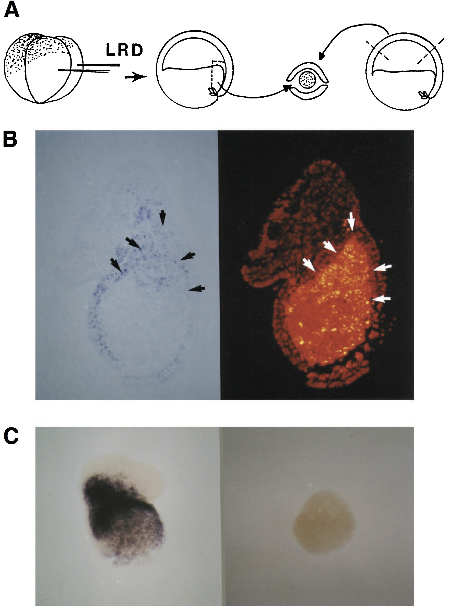 Fig. 7. Ectodermal expression of Xotx2 can be induced by vertical signals. (A) Schematic representation of construction of mesoderm-ectoderm conjugates. Albino embryos were injected with lysinated-rhodamine dextran (LRD) into the marginal zone of all blastomeres of 2-4 cell stage embryos. At early gastrula stage (10.25), involuted mesoderm was dissected out and wrapped in stage 10.25 gastrula ectoderm from uninjected albino embryos. Conjugates were developed until siblings reached stage 15, fixed, and subjected to whole-mount in situ hybridization using Xotx2 probe. (B) Light (left) and fluorescence (right) micrographs of sections through the whole-mount in situ hybridized stage 15 equivalent conjugate shown in C (left). Arrows mark the boundary between the labelled mesoderm and unlabelled animal caps. Note the ectodermal expression of Xotx2 surrounding the mesoderm. Incubation of ectoderm cap alone did not induce ectopic Xotx2 expression (C, right).
