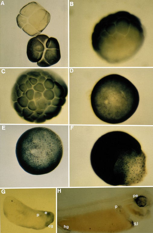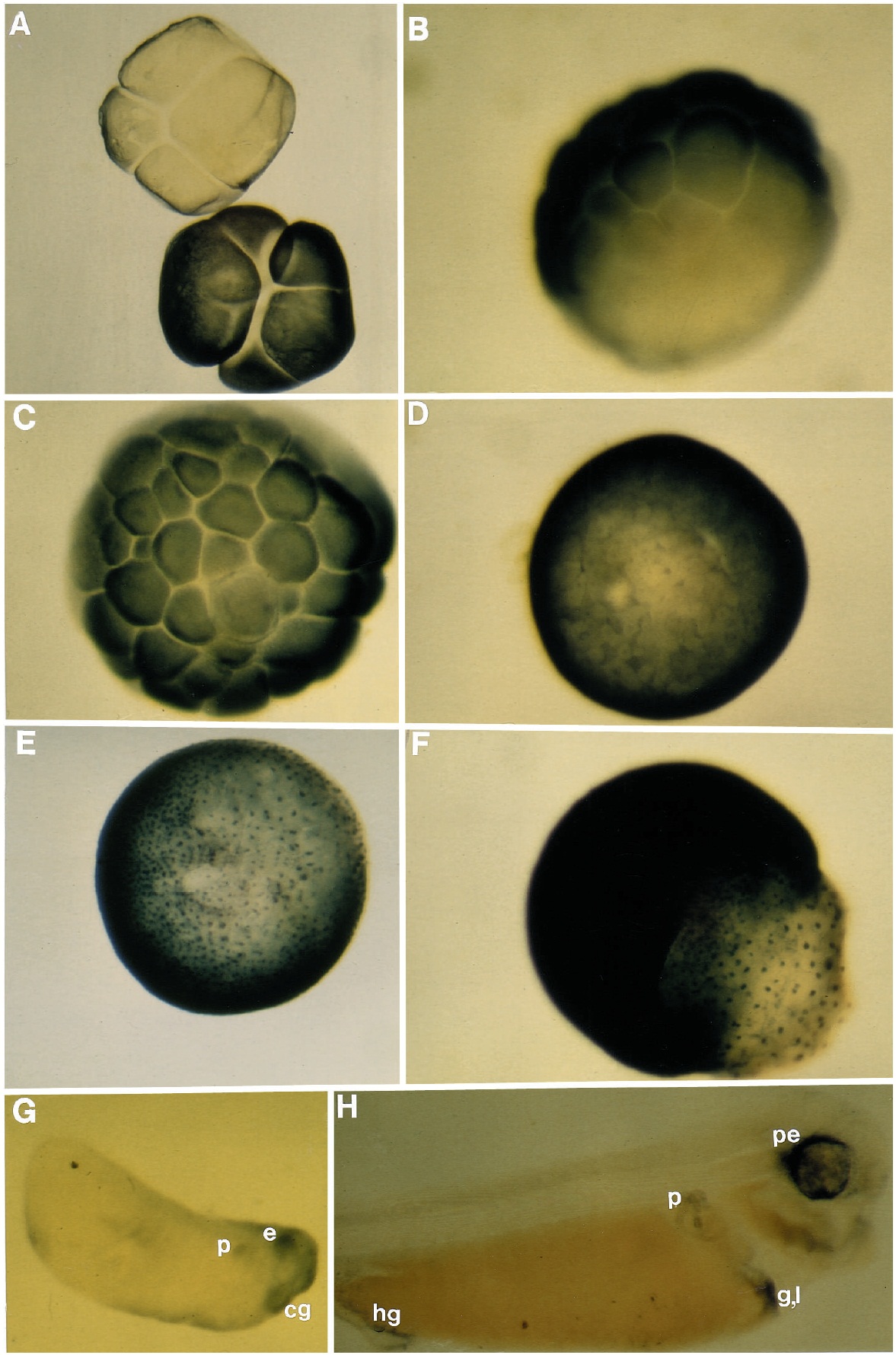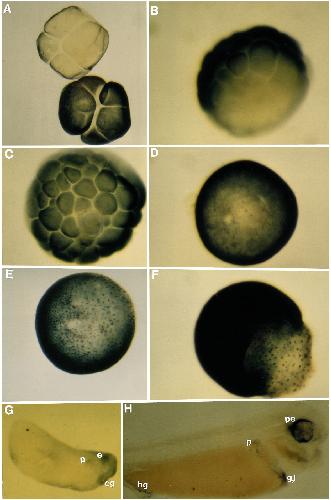 respectively. (D,E) Blastulae at stage 8 and 9, respectively, and (F) a gastrula (stage 11). (G,H) XDCoH-specific stained organs are the pronephros (p), eye vesicle (e), gut and liver (g, l) and the pigmented epithelium (pe).