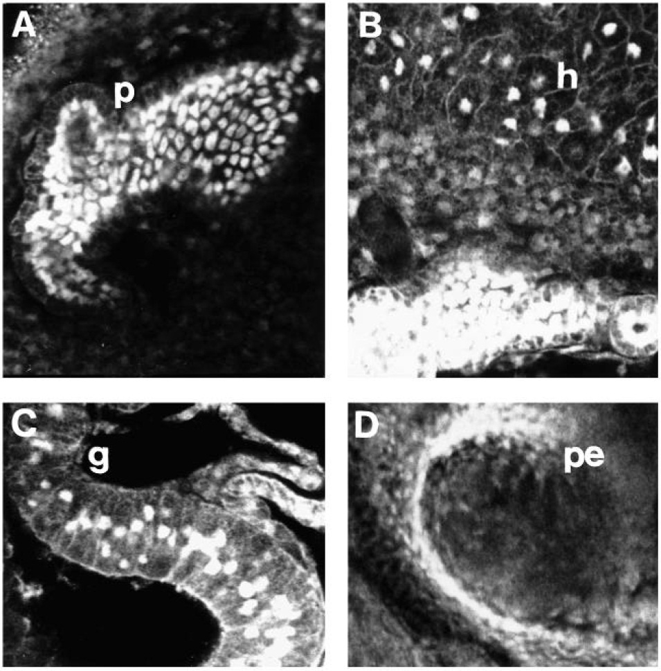 and the gut (g) as well as the pigmented epithelium (pe) of the eye