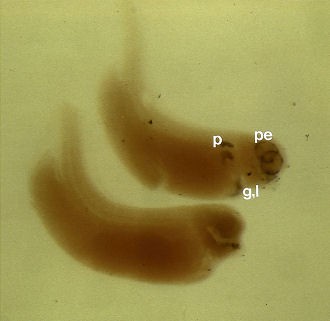 stained organs are the pronephros (p), eye vesicle (e), gut and liver (g, l) and the pigmented