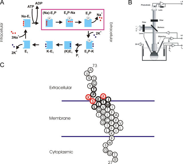 Figure 1. . (A) Albers-Post scheme for the Na+/K+ ATPase reaction cycle. (B) Scheme of the experimental setup used for voltage-clamp fluorometry. (C) Schematic diagram of the transmembrane domain and adjacent residues of the sheep β1 subunit of the Na+/K+-ATPase. The diagram depicts residues Arg-27 to Ala-73; in bold are shown the 11 residues Met-57 to Tyr-67, which were individually replaced by cysteines for the purpose of site-directed fluorescence labeling. Three residues that demonstrate significant fluorescence changes in response to voltage pulses are colored red. |